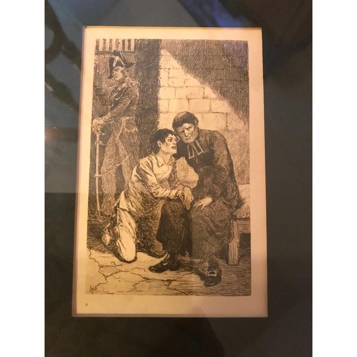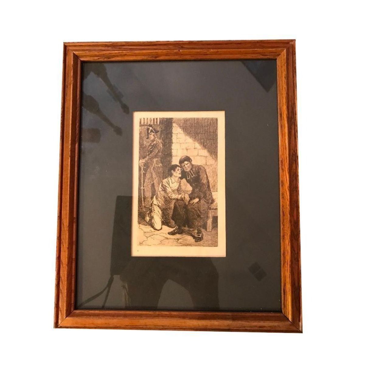 Antique Century etching, signed to the lower left, depicts a prisoner making a confession with a soldier looking on. 3 1/2" X 5 1/2" in 9" X 11" wood frame.