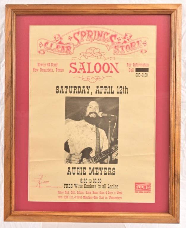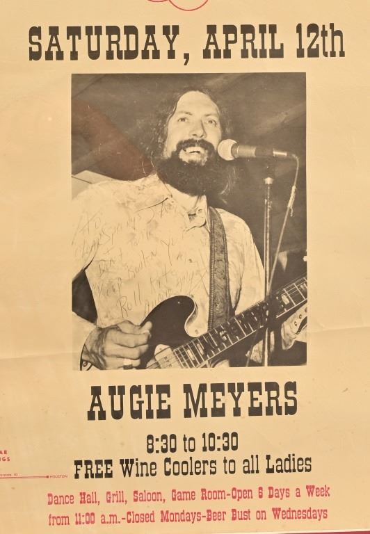 Augie Meyers signed 1975 " To Clear Springs Store Don and Jackie " Keep Rolling Your Roll Rite" . Album was released in 1972 .Poster 25" x 31" framed. "Postcard/ Membership Card The Sir Douglas Quintet " international fan club 3 1/2" x 5 1/2".