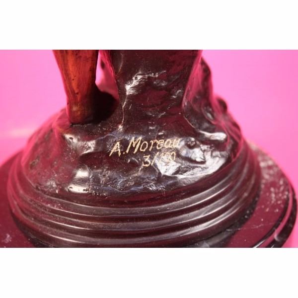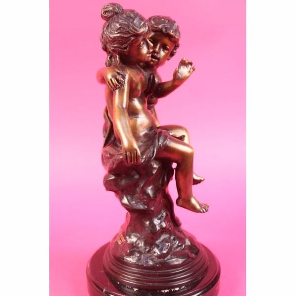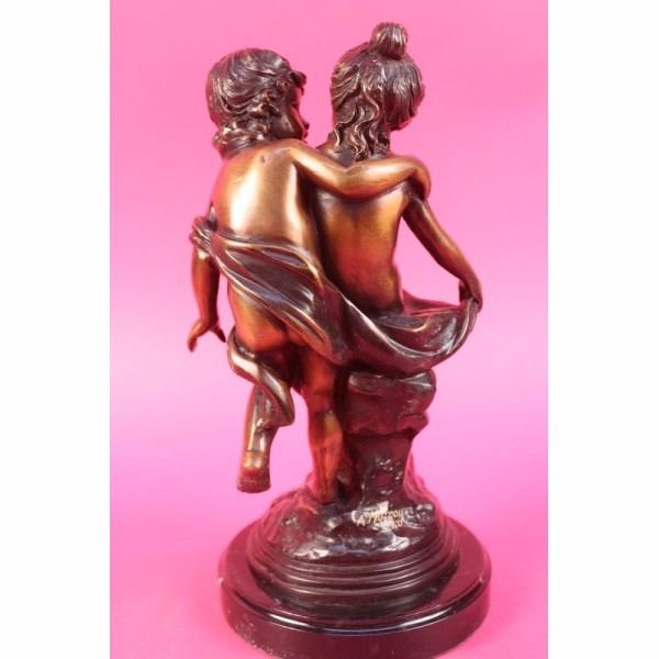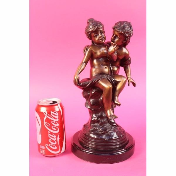 This sculpture represents pure youth and innocence between children. Two youngsiblings spend the afternoonplaying. They are eternal companions. They share a rock. One sits, while the other hops up alongside her and places an arm around her shoulder. He leans in and whispers a cherished secret for her ears only. They wear loose green patina cloths wrapped around their chubby brown waists. 100% bronze and handmade, this sculpture was cast using the "Lost Wax Method" and mounted on a marble base. It features the signature A. Moreau. Auguste Moreau (1834 to 1917) was born in the early 19th century and studied under Mathurin Moreau. Auguste Moreau worked as a sculptor and specialized in figures, statuettes and groups, mainly in marble. He made his debut at the 1861 Salon in Paris and continued to play an active part in the Salon des Artistes Francais as a member of the Societe des Artistes Francais until 1910. Condition: This sculpture is in a very Good condition. Bronze Dimensions with Marble Base:Height 13" x Width 6" Marble Dimensions: Diameter 6" Height without base: 12" Weight :10 LBS Inventory : 68-590115586