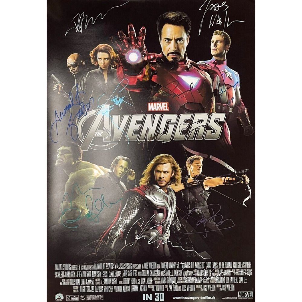 Signed by Robert Downey Jr, Chris Evans, Mark Ruffalo, Chris Hemsworth, Scarlett Johansson, Jeremy Renner, Tom Hiddleston, Clark Gregg, Cobie Smulders, Stellan Skarsgard, Samuel L Jackson, Joss Whedon, Jon Favreau & Stan Lee