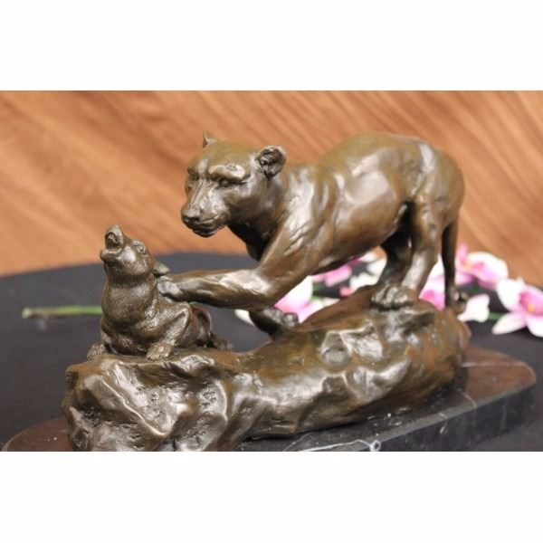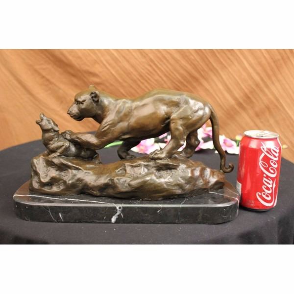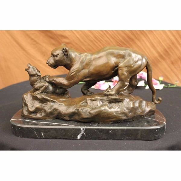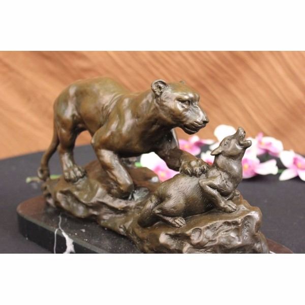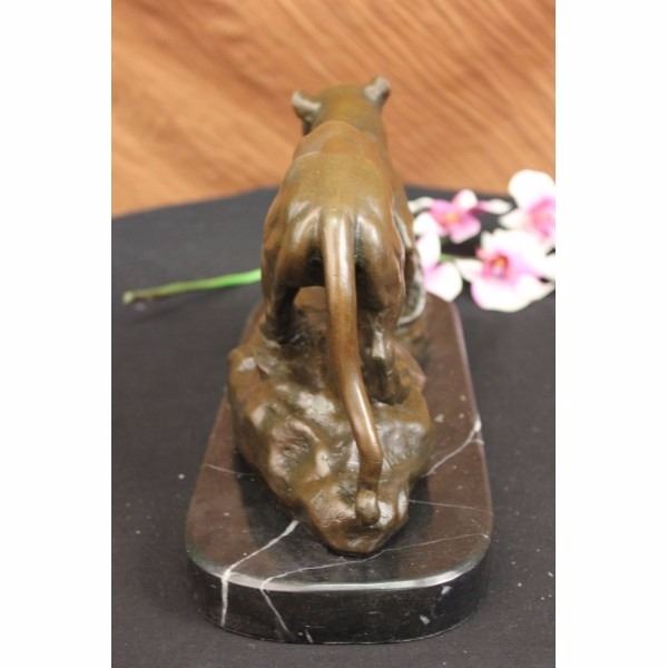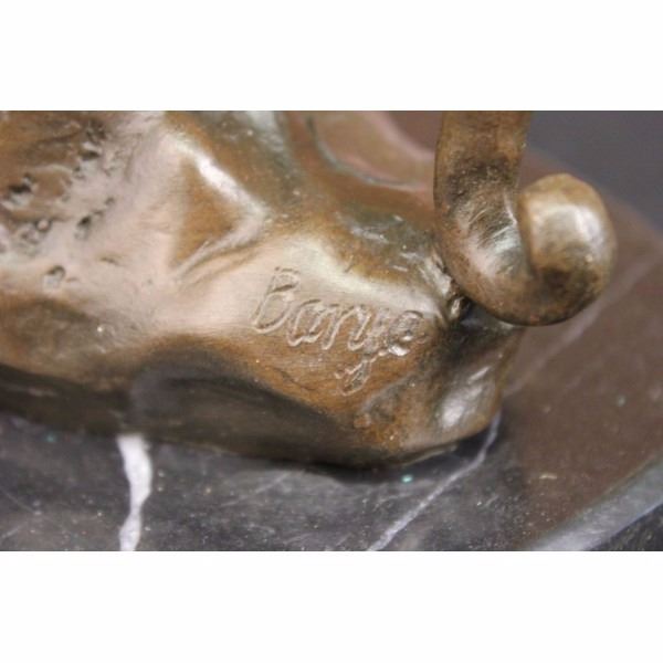 They lurk in the shadows. Their eyes see all. Their movements are lethally stealth. You won't know you're being hunted until they pounce. This poor cub discovered just that as he took a lazy moment to take a drink in what he thought was a deserted field near a pond. A quick but stealth Jaguar creeps up behind him and digs his massive paw into its back. The cub's head raises and he releases a painful howl. The Jaguar eclipses the cub in size. 100% bronze and handmade, this carefully detailed brown patina sculpture was cast using the "Lost Wax Method" and mounted on a black marble base. It is signed by the artist Barye.Antoine Louis Barye was born in France September 24th, 1796 and he died 1875. Most of his work was focused exclusively on animals, most of them wild. He was considered and Animalier, a sculptor whose works are mostly animals. Barye is a very accomplished sculptor and artist, he has exhibited some of his works in the Salon and some of his works reside in the Louvre. Condition: This sculpture is in a perfect condition. Bronze Dimensions with Marble Base:Height 8 1/2" x Width 14" Marble Dimensions: Diameter 14"height without base: 7 1/2 " Weight : 20 LBS Inventory:24DW0755442