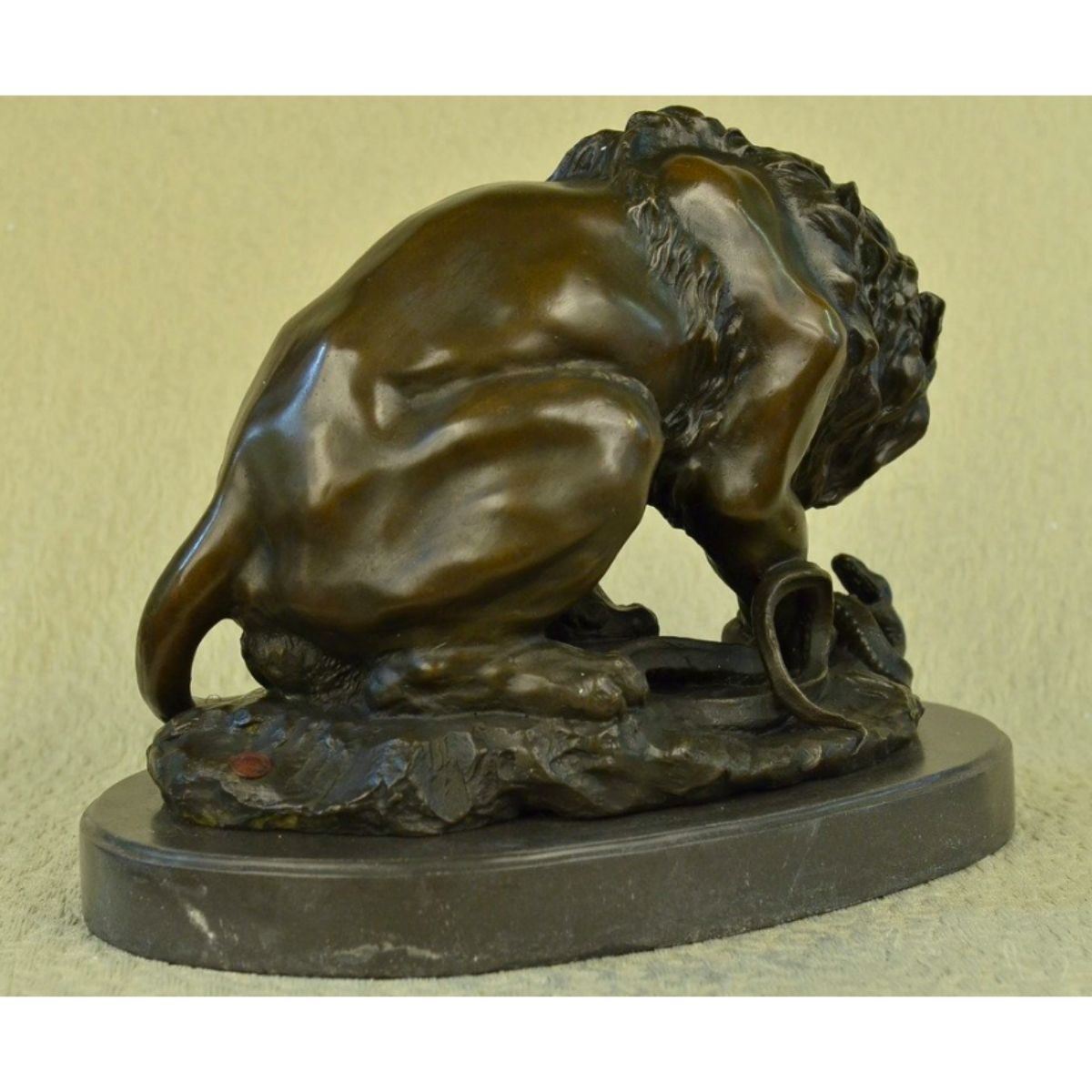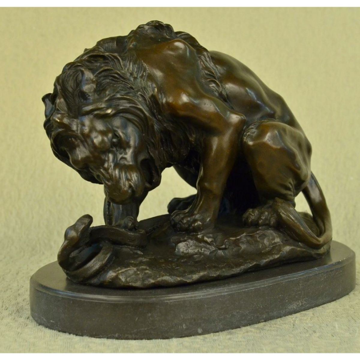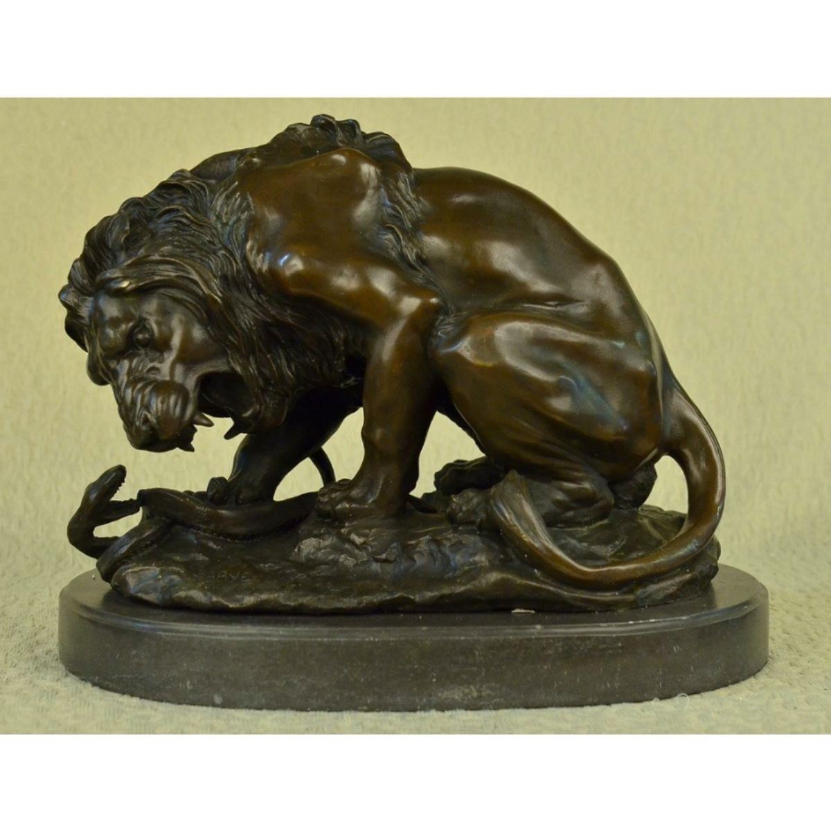 Signed Barye, large sculpture of a lion fighting a snake. Lost wax casting method bronze, with brown patina, mounted on a marble base. 14" H X 16" W. 45 lbs.