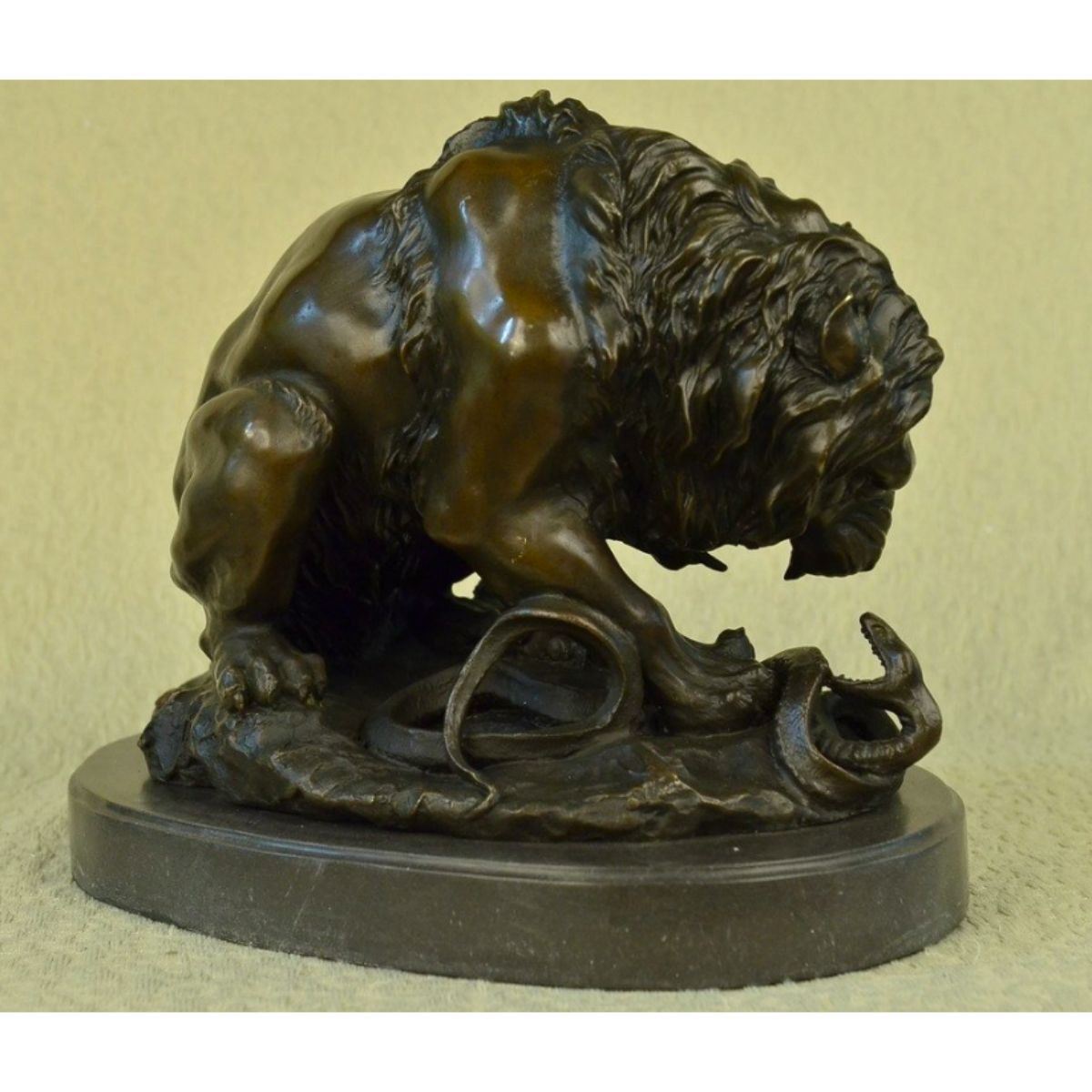 Signed Barye, large sculpture of a lion fighting a snake. Lost wax casting method bronze, with brown patina, mounted on a marble base. 14" H X 16" W. 45 lbs.
