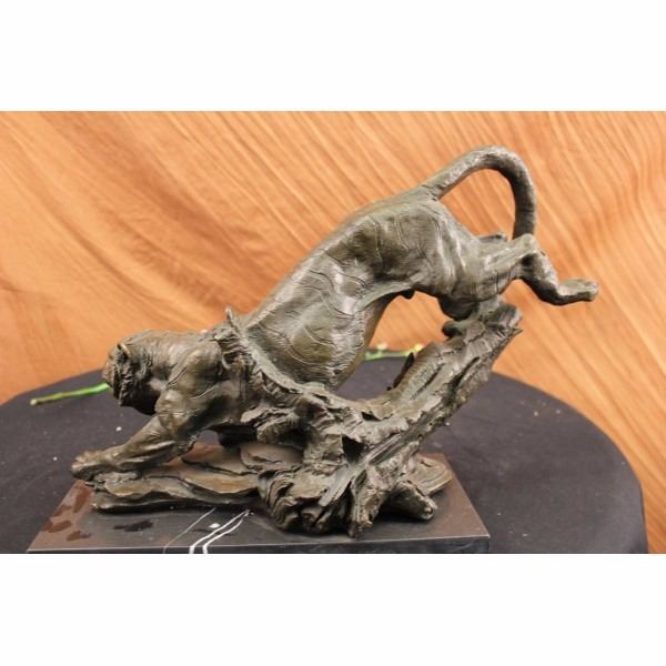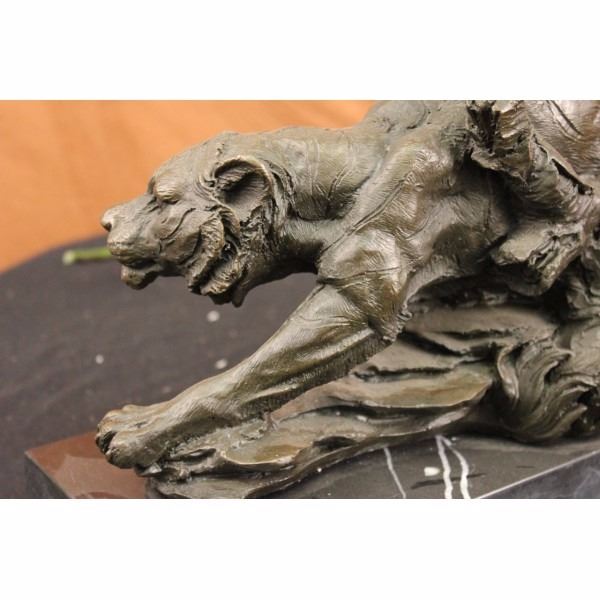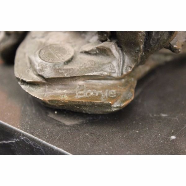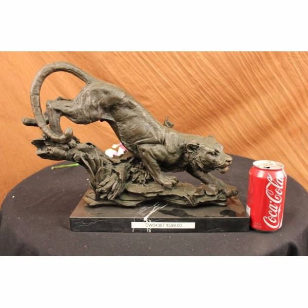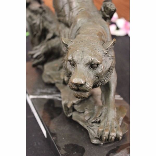A predator among predators, the tiger is a powerful and magnificent creature. Theytravel alone and havepay no allegiance to anyone. They are brutal killers, and yet they are excellent caregivers for their cubs.The tiger, a member of the Felidae family, is the largest of the four "big cats" in the genus Panthera. Native to much of eastern and southern Asia, they are indigenous to some of the more densely populated places on earth, which has caused significant conflicts with humans. Three of the nine subspecies of modern tiger have gone extinct, and the remaining six are classified as endangered. The tiger is the worlds favorite animal (dogsarethe second). Some people compare the behaviors of tigers to that of humans. People can relate to the tiger, as it is fierce and commanding on the outside, but noble and discerning on the inside. This isa beautiful sculpture cast in bronze through the "Lost Wax Method." This sculpture was handcrafted and signed by Barye. It is stamped with the European Bronze Finery seal and mounted on a solid black marble base. Condition: This sculpture is in a very Good condition. Bronze Dimensions with Marble Base:Height 13" x Width 18" Marble Dimensions: 18" X 5 1/2" Height without base: 12" Weight : 25 LBS Inventory : 68DW0437986