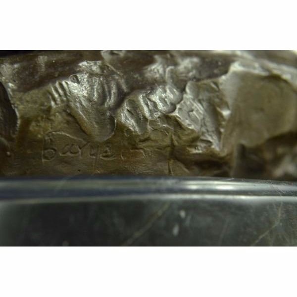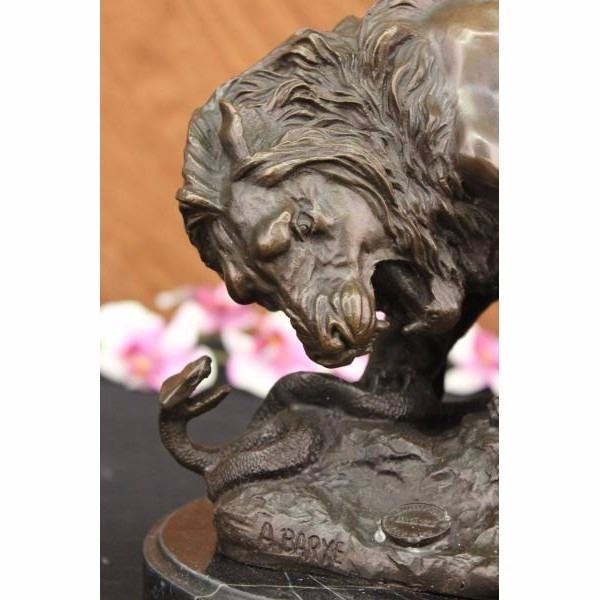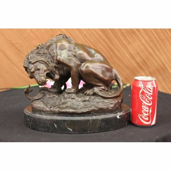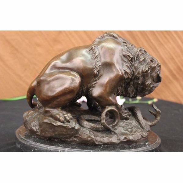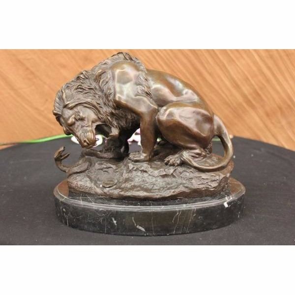 The venomous snake approached the lion confident it would frighten the wild animal. The lion is not one to be frightened easily. The lion stands courageously and ferociously over the snake giving a loud roar. He's shown the snake who is boss! The snake is attempting to retreat before it is quickly killed by the lion. This sculpture was crafted using the lost wax method. It stands on a black marble base. It is signed A. Barye. Condition: This sculpture is in perfect condition. Bronze Dimensions with Marble Base:Height 10" x Width 12" Marble Dimensions:Diameter 11 " Height without base: 9" Weight :20 LBS Inventory : 14X21336641