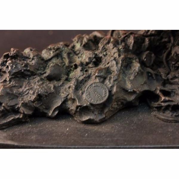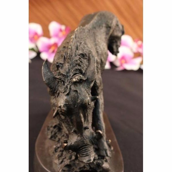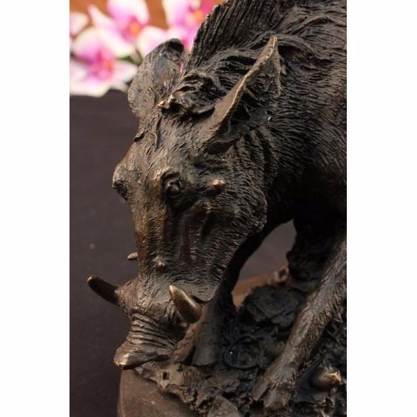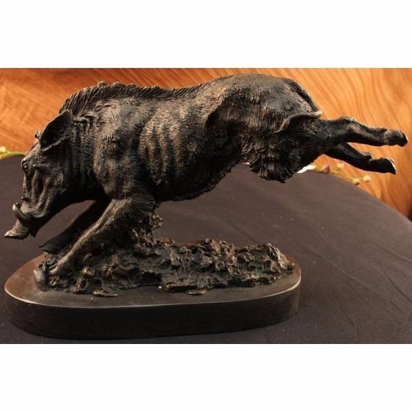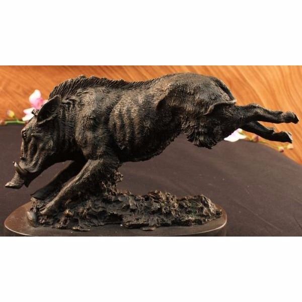 The body of the wild boar is compact; the head is large, the legs relatively short. The fur consists of stiff bristles and usually finer fur. The colour usually varies from dark grey to black or brown, but there are great regional differences in colour; even whitish animals are known from central Asia. During winter the fur is much denser. Adult boars average 120180cm in length and have a shoulder height of 90cm. As a whole, their average weight is 5090kg kilograms (110200pounds), though boars show a great deal of weight variation within their geographical ranges. In central Italy their weight usually ranges from 80 to 100kg; boars shot in Tuscany have been recorded to weigh 150kg (331lb). A French specimen shot in Negremont forest in Ardenne in 1999 weighed 227kg (550lb). Carpathian boars have been recorded to reach weights of 200kg (441lb), while Romanian and Russian boars can reach weights of 300kg (661lb). This boar hog is running as fast as he cant before the hunters catch him, he watches his back with his eyes rearing behind him to see who is behind him. The handmade bronze sculpture was cast using the age-old method of lost-wax casting and stained with a brown patina finish for preservation. It is mounted upon a black marble base with the artist Barye's signature. Condition: This sculpture is in perfect condition. Bronze Dimensions with Marble Base:Height 8" x Width 12" Marble Dimensions: Diameter 9" Height without base: 7" Weight : 10 LBS Inventory : 62Y6433626