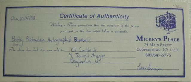 Signed Baseball BOBBY RICHARDSON With CA: American League Baseball Signed by Yankee Superstar BOBBY RICHARDSON with Certificate of Authenticity from MICKEYS PLACE, COOPERSTOWN, NY. With Plastic Case. (20-40)