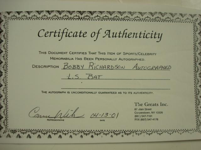 Signed Baseball Bat BOBBY RICHARDSON with CA: LOUISVILLE SLUGGER Signed by 1960 World Series MVP. Signed Bobby Richardson #1 1960 W.S. M.V.P. with Protective Plastic Case. Certificate of Authenticity from The Greats Inc, Cooperstown NY. (100-200)