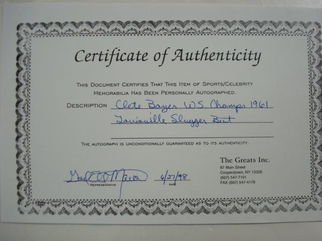 Signed Baseball Bat CLETE BOYER with CA: LOUISVILLE SLUGGER Signed by 1961 World Series CHAMP Signed "Clete Boyer #6 W.S. Champs 1961". With Protective Plastic Case. With Certificate of Authenticity from The Greats Inc, Cooperstown NY. (200-300)