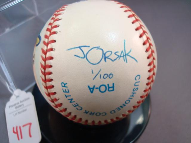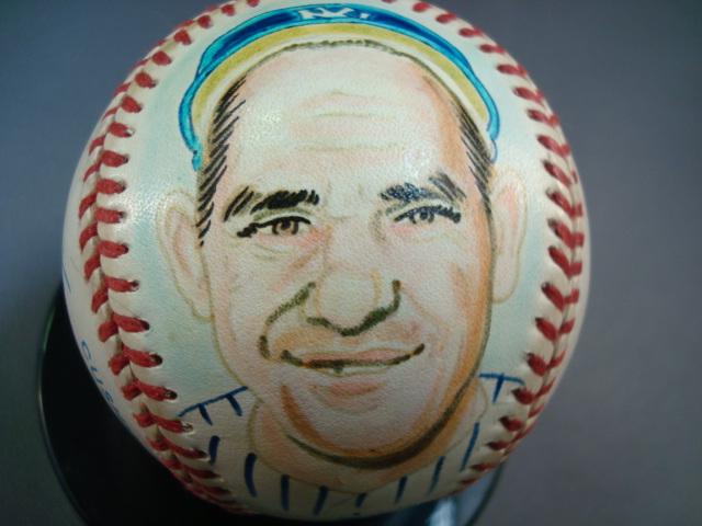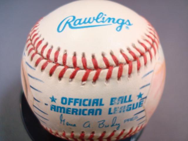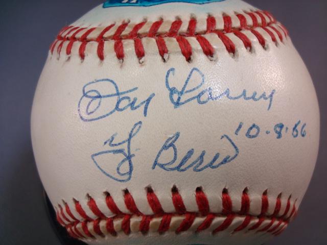 Signed Baseball DON LARSON and YOGI BERRA: American League Baseball Signed by Don Larsen with Date of World Series Perfect Game and his Catcher Yogi Berra. Pictures of Larsen and Berra by JOrsak (100-300)