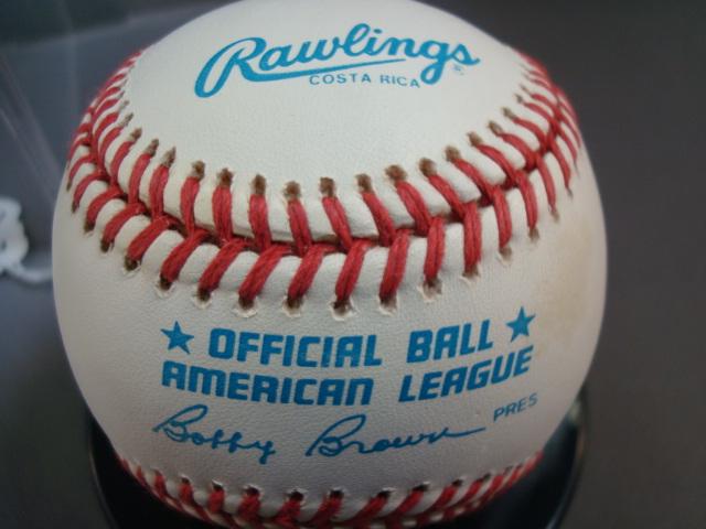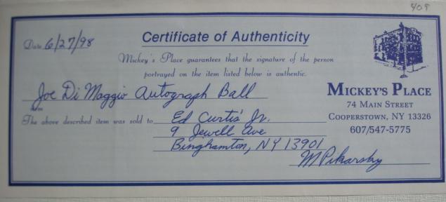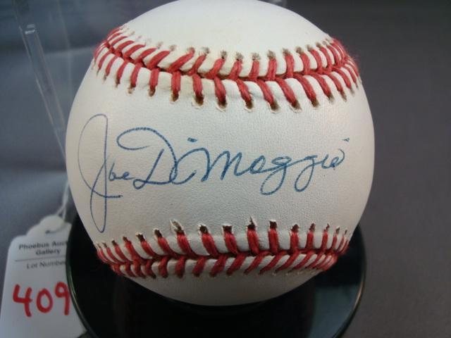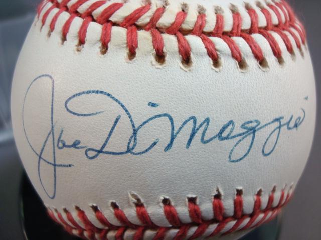 Signed Baseball JOE DiMAGGIO With CA: American League Baseball Signed by Yankee Superstar Joe DiMaggio with Certificate of Authenticity from Mickey's Place Cooperstown NY. With Plastic Case. Excellent Condition. Reserve $800 (500-1000)