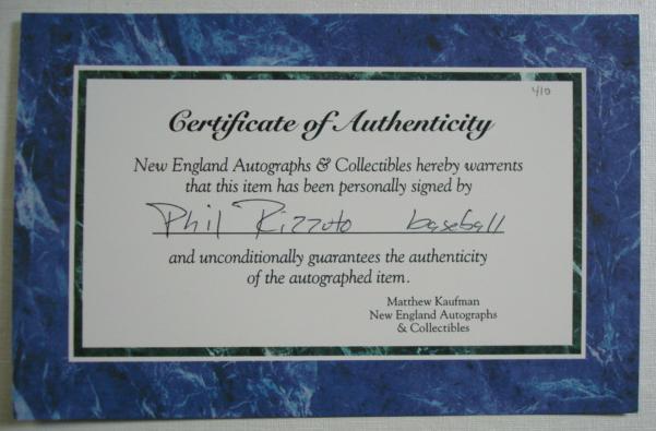 Signed Baseball PHIL RIZZUTO With CA: American League Baseball Signed by Yankee Superstar PHIL RIZZUTO with Certificate of Authenticity from TD Collectibles, Syracuse, NY. With Plastic Case. (40-80)