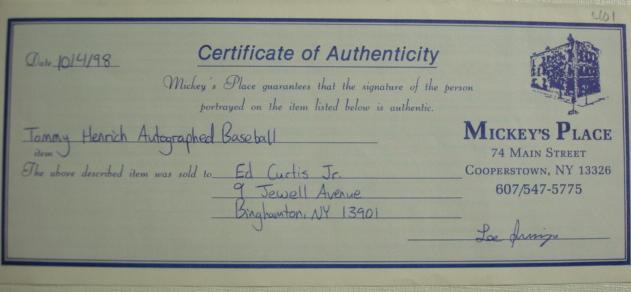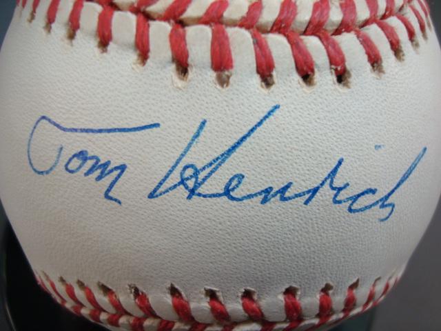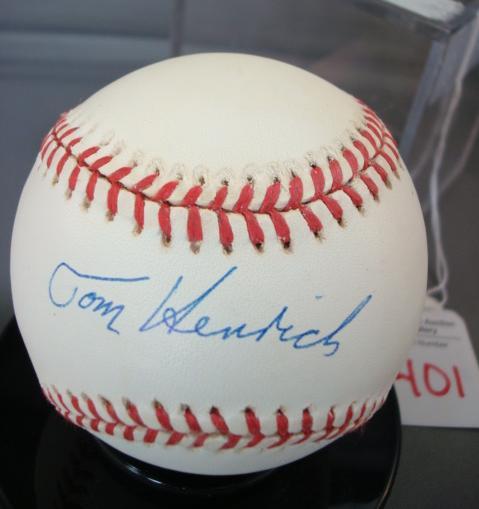 Signed Baseball TOMMY HENRICH With CA: American League Baseball Signed by Yankee Superstar TOMMY HENRICH with Certificate of Authenticity from MICKEYS PLACE, COOPERSTOWN, NY. With Plastic Case. (30-60)