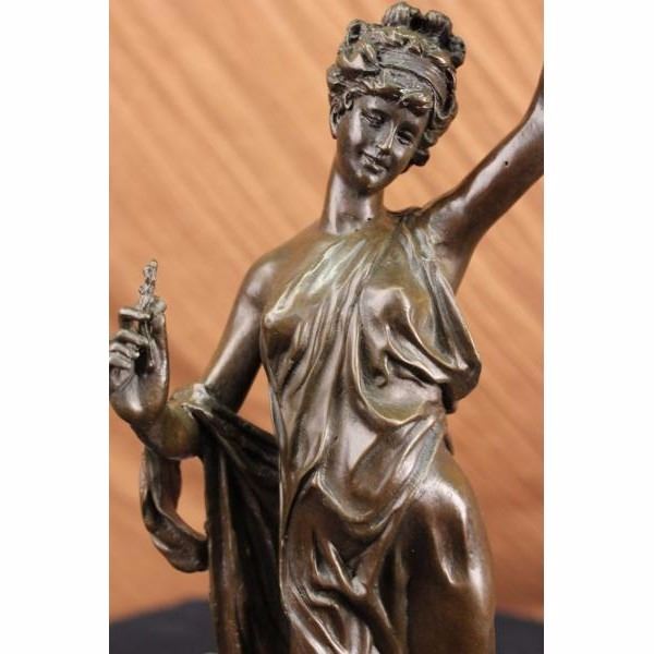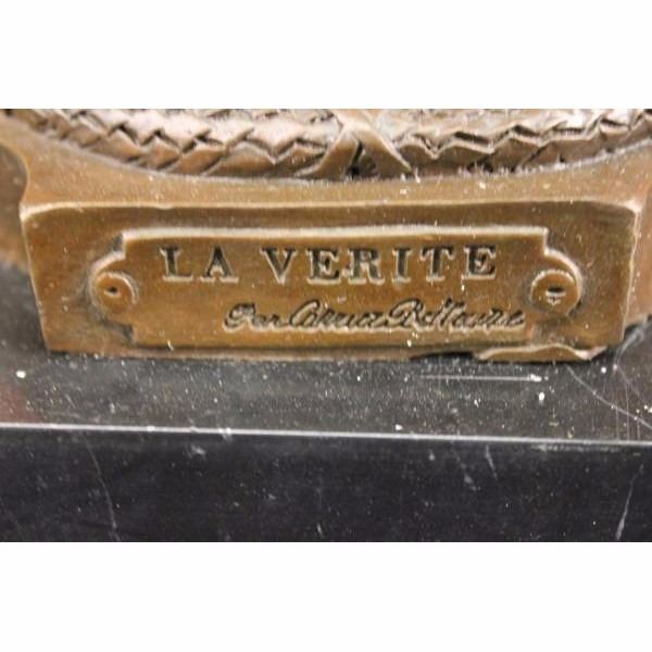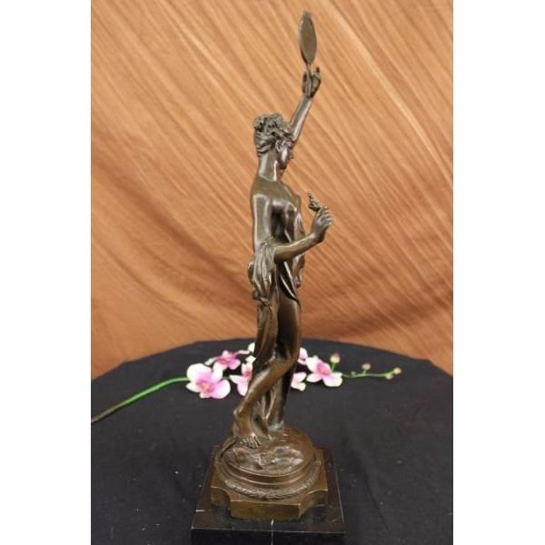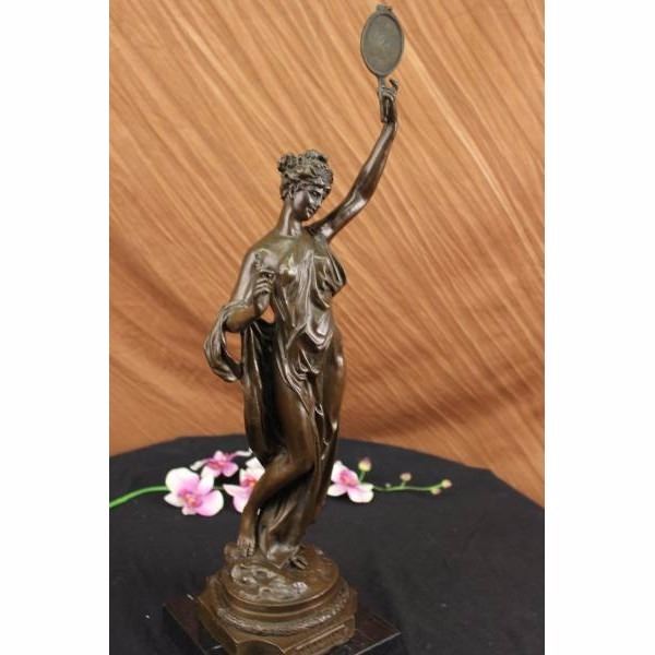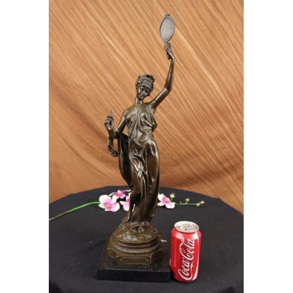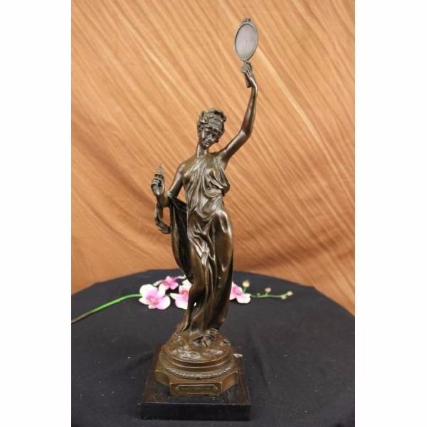This sculpture is beautiful, would go perfect in Your or a Friends living room. She is wearing a robe dress that hangs real low to the floor and looks amazing on her body as it just lays on her frame. On one side she is completely covered and on theothersidesheletsthe end rest on her right wrist,exposing some ofher body. She gracefully smiles and look down at the floor, asher leftarmis holding agorgeous old fashion mirror. This sculpture is casted using the ancient old "Lost Wax Method" stained in brown patina. She is mounted atop a black marble base and is signed Carrier Belleuse Condition: This sculpture is in perfect condition. Bronze Dimensions with Marble Base:Height 22" x Width 109" Marble Dimensions: 6" X 6 1/2" . Height without base: 21" Weight : 17 LBS Inventory 97-X2246B6179