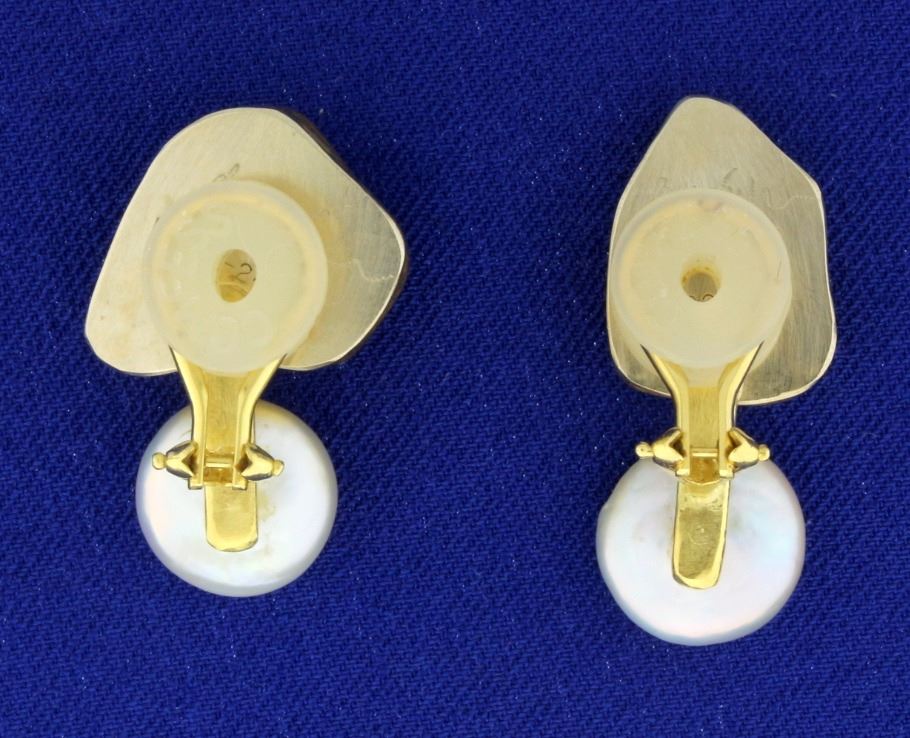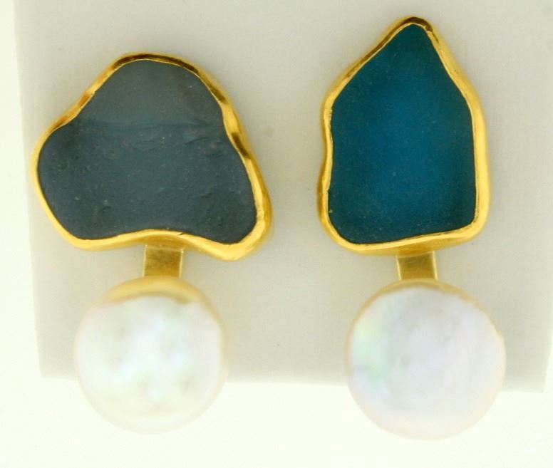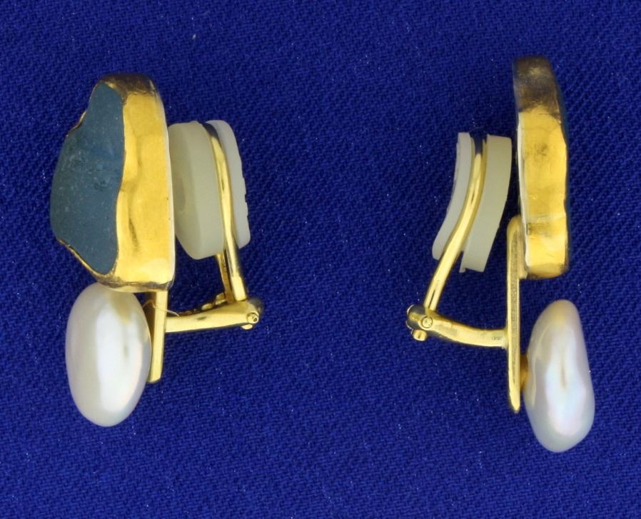 In 18k yellow gold with 22k and 24k accents. Each earring contains a 12mm natural pearl with excellent color and luster. Also contains a hand blown crystal with deep blue color. 1 1/4" long, for non pierced ears. 14.5g.