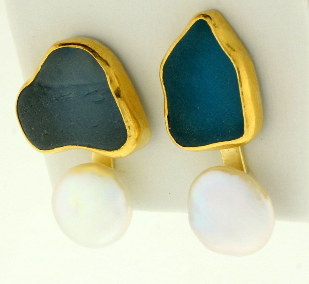 In 18k yellow gold with 22k and 24k accents. Each earring contains a 12mm natural pearl with excellent color and luster. Also contains a hand blown crystal with deep blue color. 1 1/4" long, for non pierced ears. 14.5g.