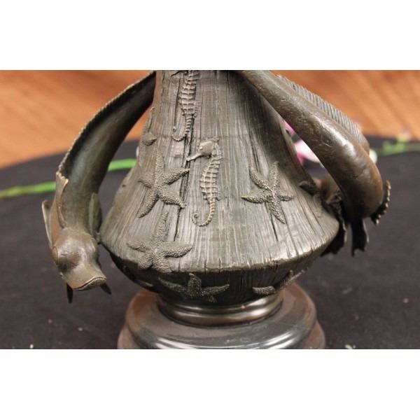 It's an underwater discovery. Two curious fishes circle a vase thathas sunk to their ocean floor. Starfish and seahorses have alreadymade this vase their home, clinging to its sides. The fishes brushalong the sides cautiously, inspecting the strange artifact. Carefullydetailed, you can feel the scales of the fish and seahorses and thegentle bumps of the starfish. It is a perfect gift for any mariner'svessel. 100% bronze and handmade, this brown patina sculpture, whichis mounted on a black marble base, was cast using the "Lost WaxMethod" and signed by the artist L.L. Blairsy.Leo Laporte-Blairsy (1867-1923) Paris. He studied under Falguiereand Mercie. Like may of his time, he exhibited at the Salon DesArtistes Francais, winning numerous medals in the 1890's, becoming aChevalier of the Legion of Honour in 1903. Condition: This sculpture is in a very Good condition. Bronze Dimensions with Marble Base:Height 13" x Width 9" Marble Dimensions:Diameter 5" Height without base: 11" Weight :9 LBS Inventory : 63B6715636