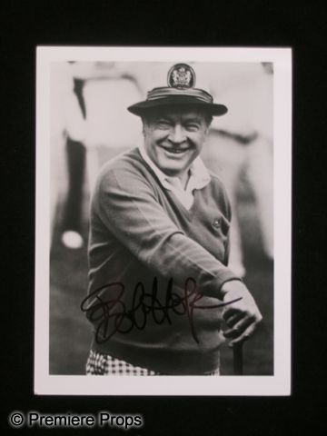 An autographed, B&W smaller size photograph of one of the greatest entertainers in Hollywood's history, Bob Hope. With a career that spanned 60 years, Bob Hope epitomized what an entertainer was, making over seventy films and shorts, starring in numerous television roles, and all the while finding time to act as a humanitarian around the world, with a special emphasis on entertaining our Armed forces. A truly remarkable man. The photo features Mr. Hope playing a round of golf and is signed in black ink. (measures approx. 5" x 7")