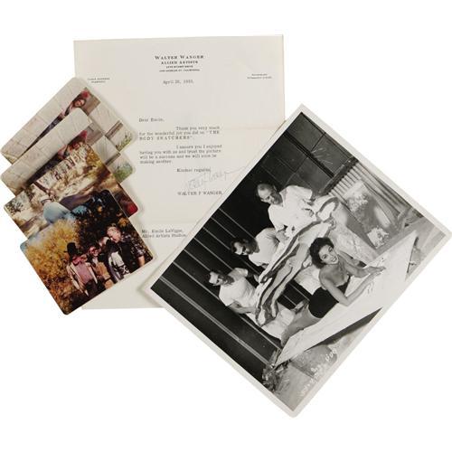 <B>Walter Wanger Signed "Invasion of the Body Snatchers" Letter.</B></I> A typed letter, dated April 20, 1955, on letterhead from the producer to make-up artist Emile LaVigne, signed by Wanger in blue ink. It reads: "Dear Emile, Thank you very much for the wonderful job you did on 'The Body Snatchers.' I assure you I enjoyed having you with us and trust the picture will be a success and we will soon be making another." The film was released as <I>Invasion of the Body Snatchers</B></I> and became an instant sci-fi classic. Also included is a b&w 8" x 10" promo still of a body cast being made of actress Dana Wynter for role of "Becky Driscoll", as well as four color 3.5" x 4.5" snapshots from the set of <I>Rooster Cogburn,</B></I> including images of John Wayne and Katharine Hepburn. Items are in overall Excellent condition with some very mild wear and discoloration.<I>From the estate of Emile LaVigne.</B></I><BR><BR><b>Shipping:</b> Small Flat (<a target="_blank" href="http://www.heritageauctions.com/common/shipping.php">view shipping information</a>)