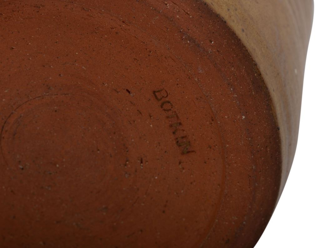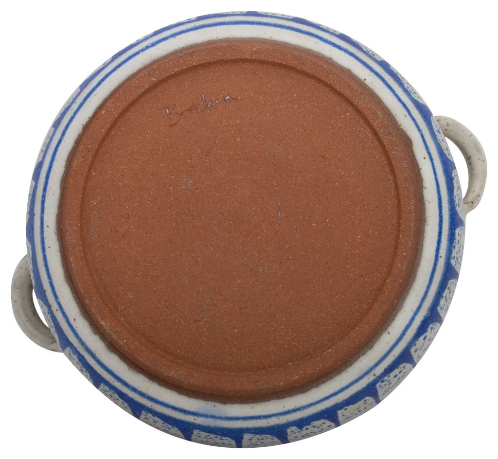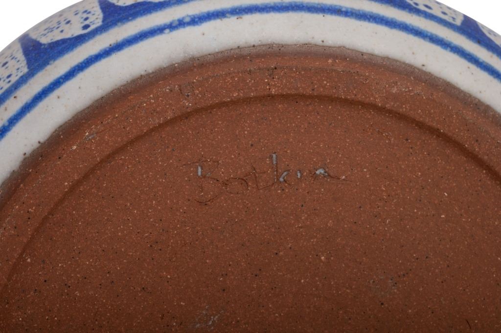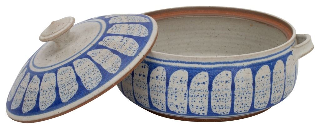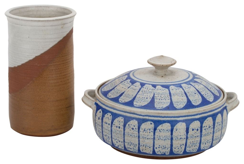 Item/Description: Two Botkin pottery pieces. Includes blue & white lidded tureen and a stoneware vase with double dip glaze. Both pieces are stamped Botkin.
