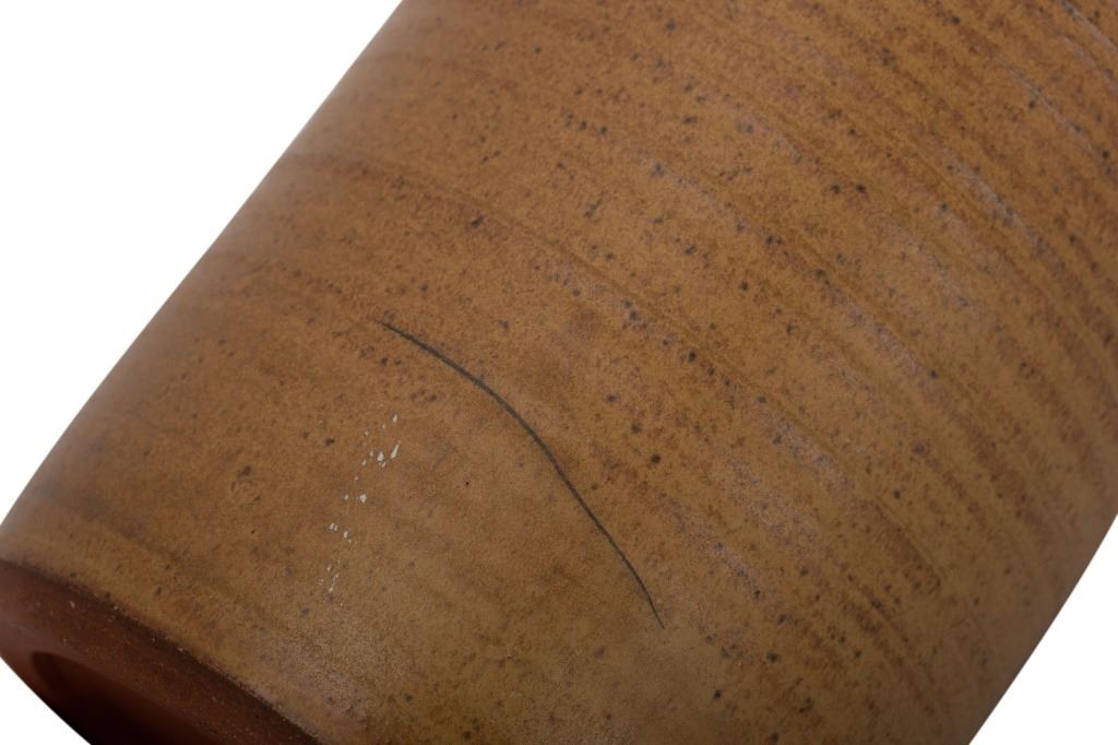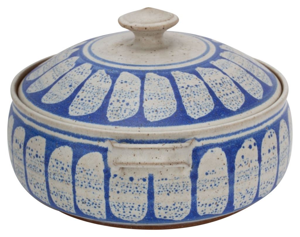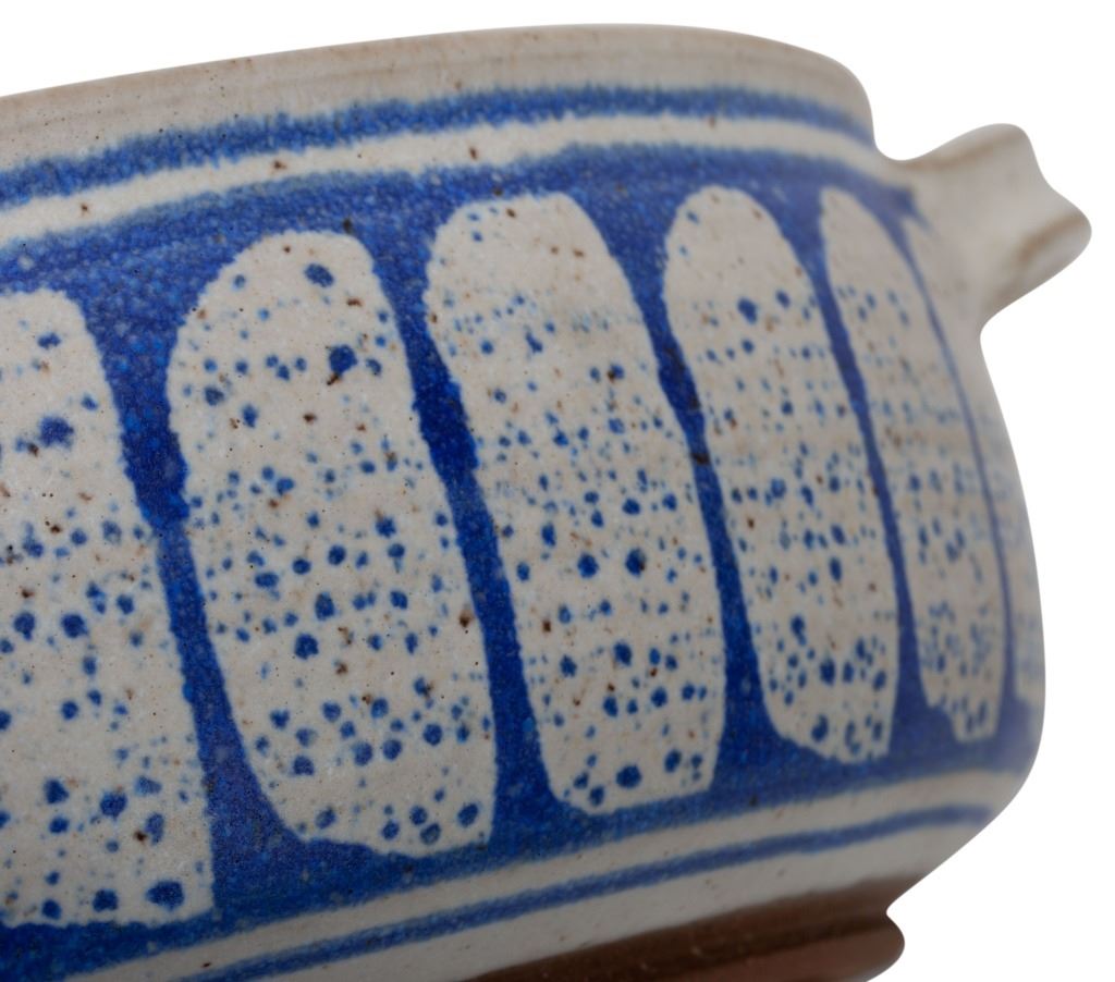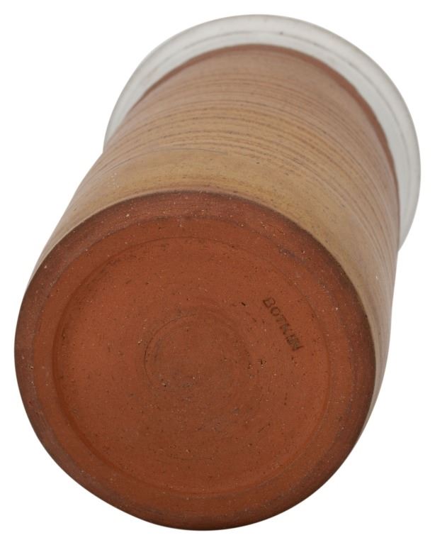 Item/Description: Two Botkin pottery pieces. Includes blue & white lidded tureen and a stoneware vase with double dip glaze. Both pieces are stamped Botkin.