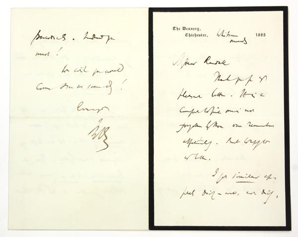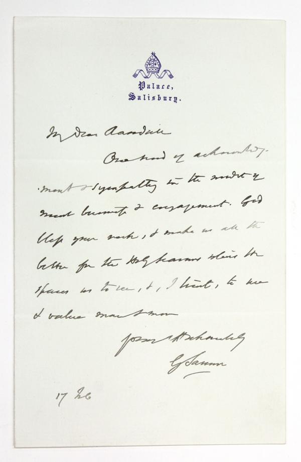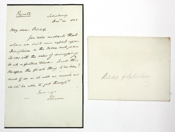 (lot of 4) Associated signed British religious letters and correspondence, including a letter from the Palace at Salisbury, a letter from the Bishop of Salisbury, with an envelope, and a letter the Deanery at Chichester, dated 1885, largest: 7'' x 9''