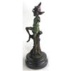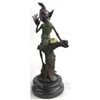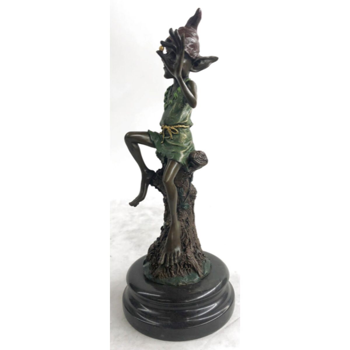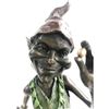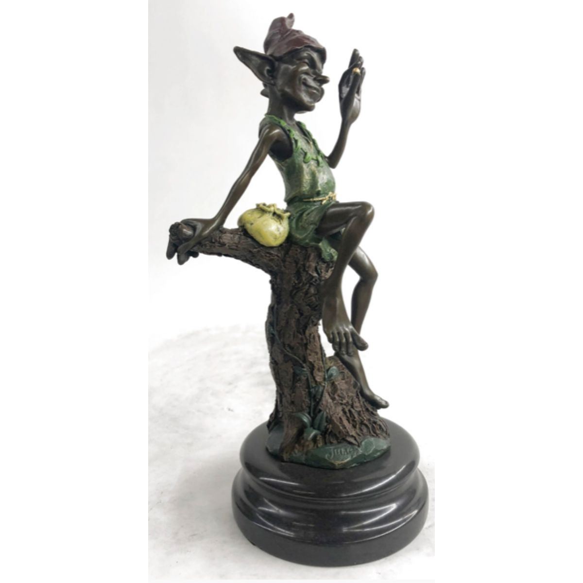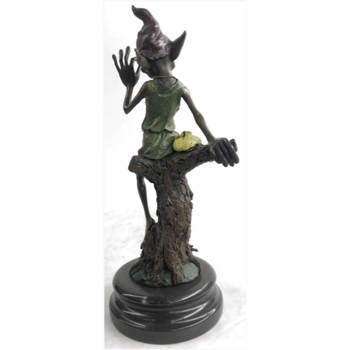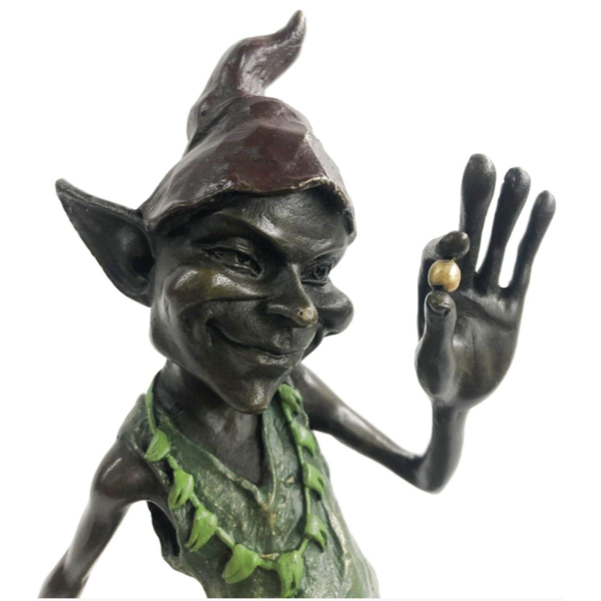 Elf, Leprechaun sculpture, signed by the artist, Juno, at base. Lost wax casting method bronze, with colored patina, mounted on a marble base. 12" H X 5" W. 6lbs.Â