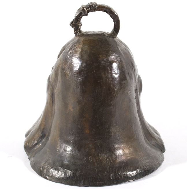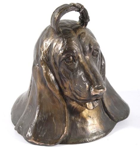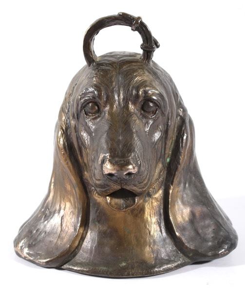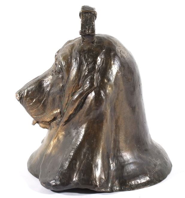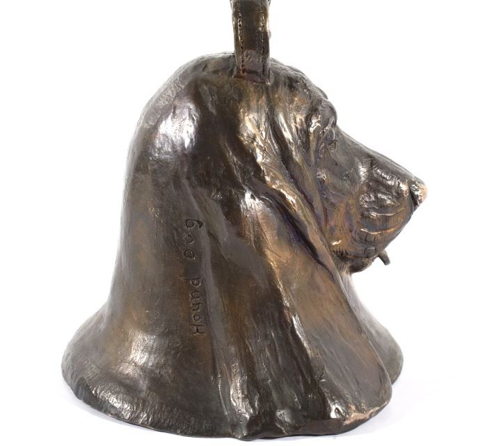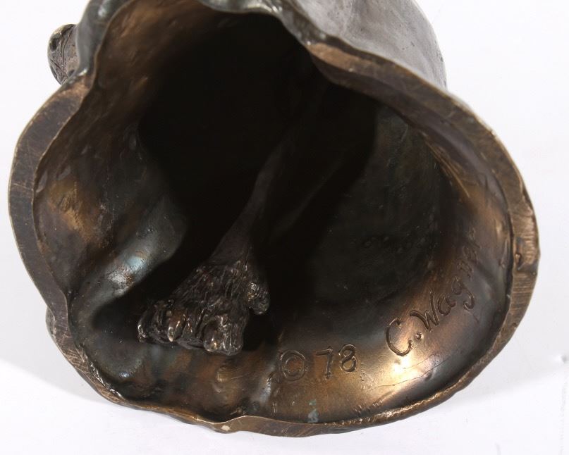 For your consideration in this lot we have a signed basset hound bronze bell by Carl Wagner in 1978. Wagner (1938- 2011) was a artist located in Colorado who was known for his sculptures of animals and wild life. The bell shows solid bronze construction and is part of a limited edition collection. The bell is made in the likeness of a basset hound with the clapper in the shape of a dog paw. The piece shows good detail in the face of the hound. The bell is signed on the inside reading "C 78 C. Wagner 85/1000" and is marked behind the right ear reading "Hound Dog". It shows good condition overall with some light wear. The piece measures 5 1/4" tall with a diameter of approximately 4 3/4".