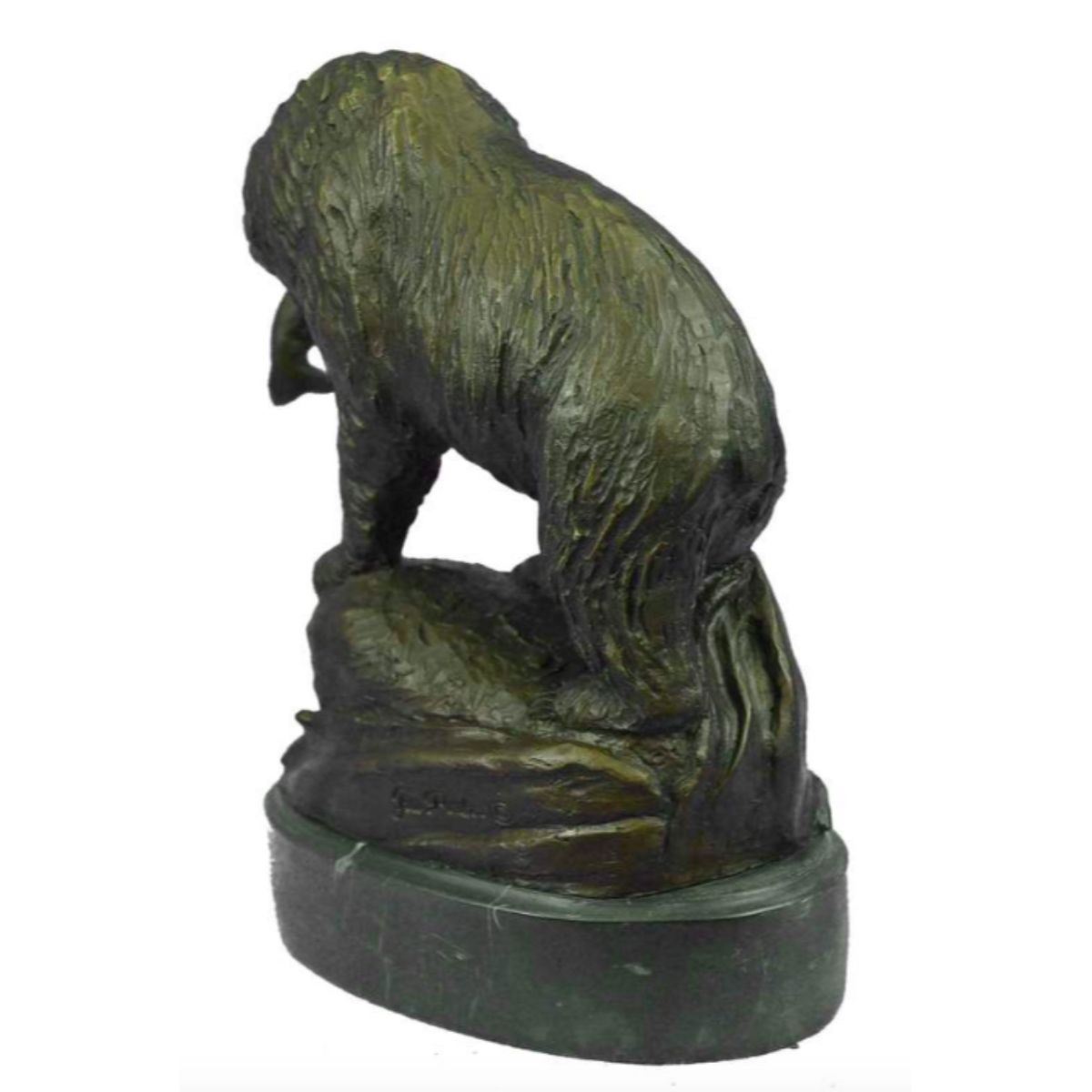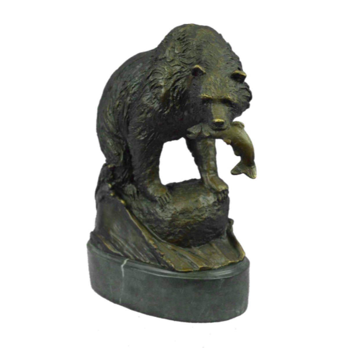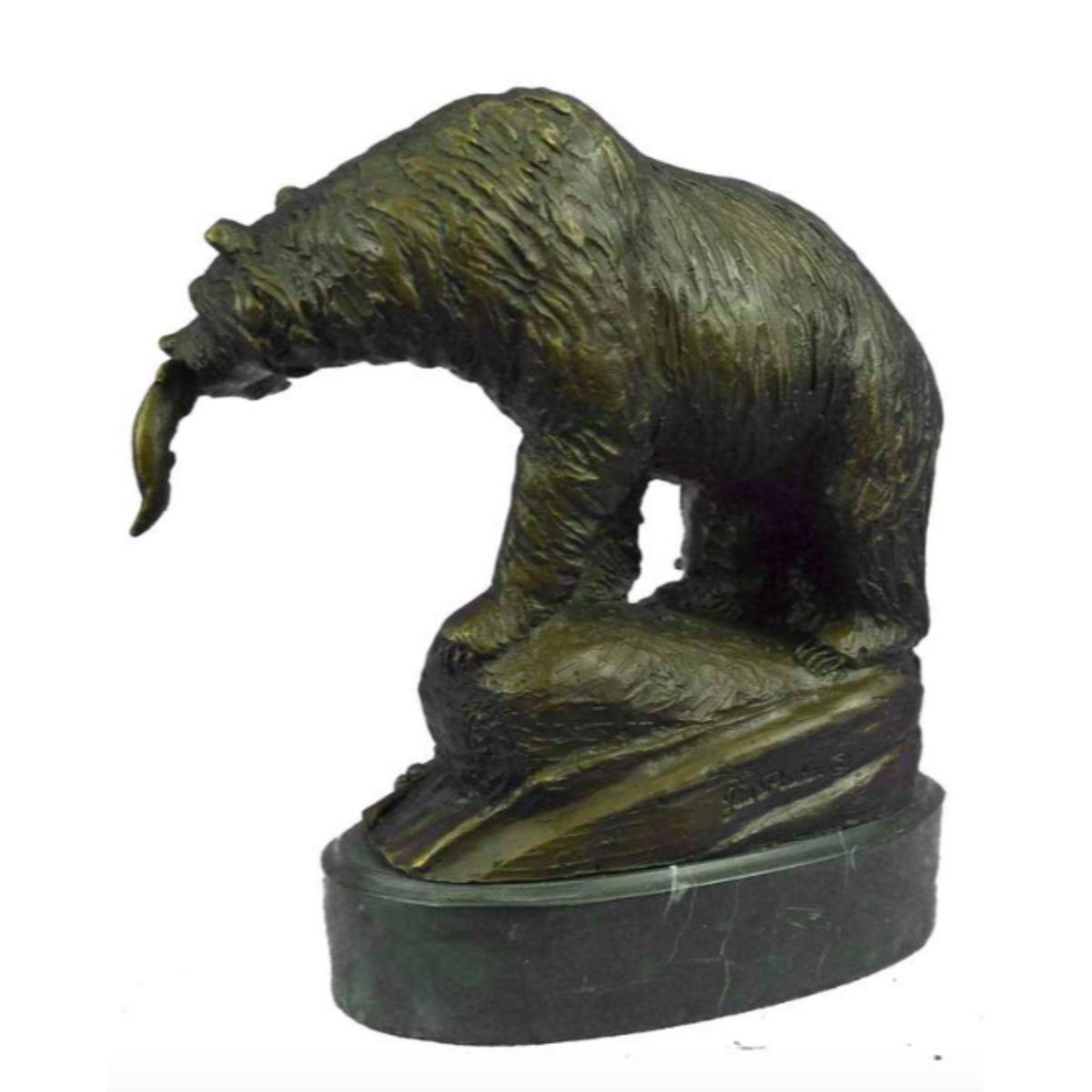 Young Bear With Catch of the Day fish camp, lodge sculpture. Signed by artisan Jim Ponter on base. Lost wax casting method bronze, with brown patina, mounted on marble base. 9" H X 8" W. 7lbs weight.