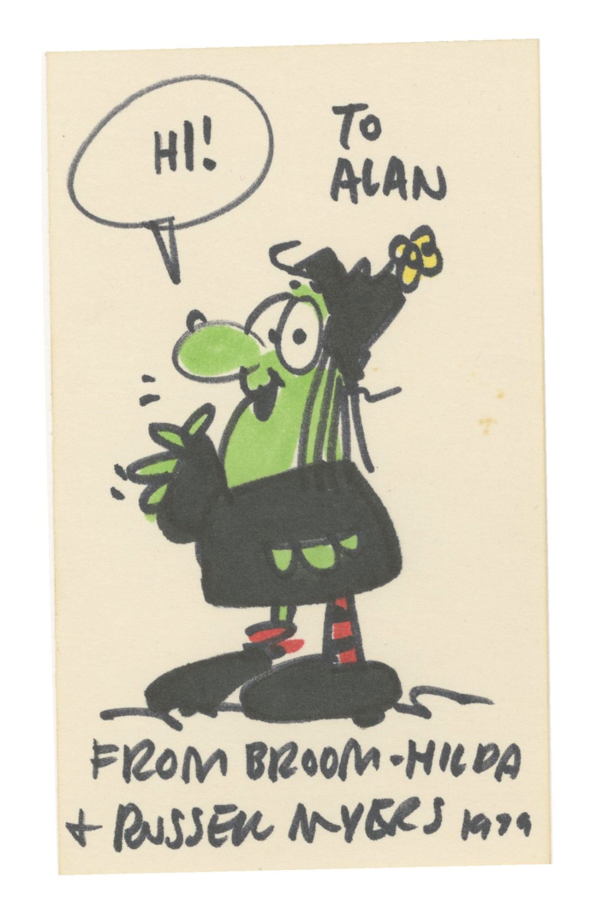 (Russell Myers, 1979) An original drawing featuring Broom-Hilda, illustrated and signed by the strip's creator, Russell Myers. Accomplished in colored marker on paper, the drawing is personalized "To Alan" and signed "From Broom-Hilda + Russell Myers". Measuring 5"x3", the drawing is in good condition with minor surface wear.