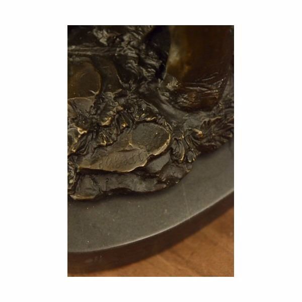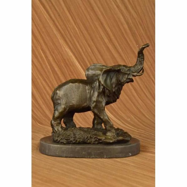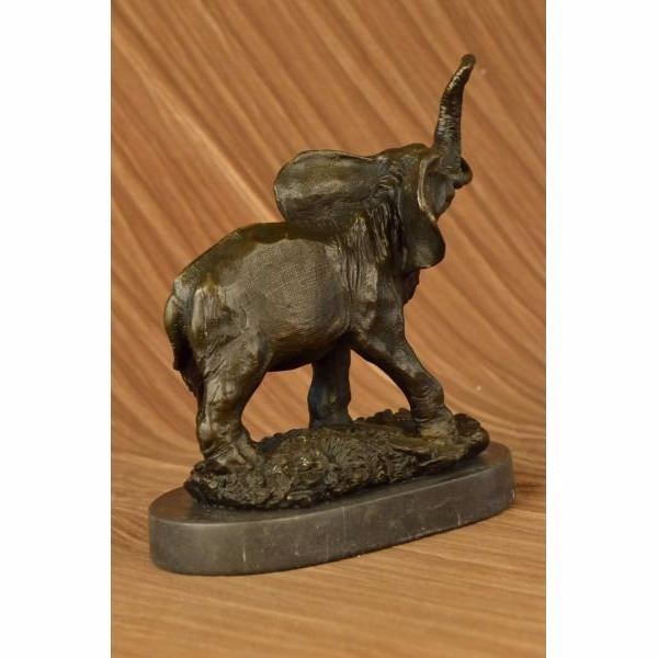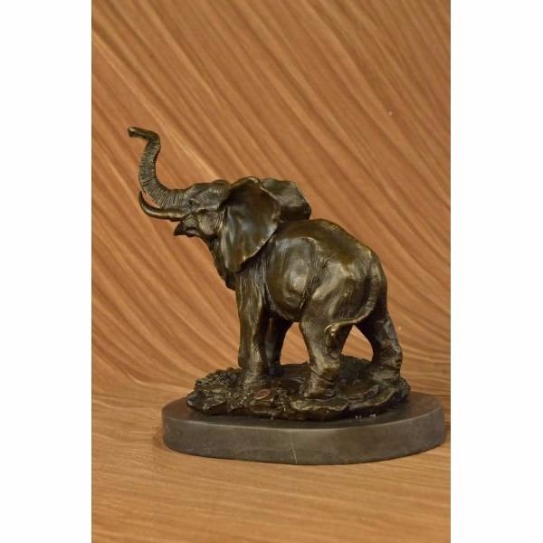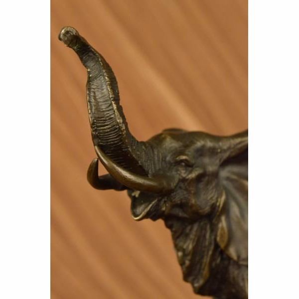Many don't consider the elephant for its beauty and grace but rather its size and funny trunk, but there is something to love about this large creature besides Walt Disney Dumbo. This sculpture brings out the beauty of the elephant, focusing on the parts that make it unique. If you turn it to face you, you will be greeted by a beautiful face. It's large clumsy flapping ears frame his face. His long trunk curls and reaches out towards you to shake. The smooth brown patina compliments the exquisite details of his fat round body. 100% bronze and handmade, this sculpture was cast using the "Lost Wax Method" and signed by the artist Bugatti. Condition: This sculpture is in perfect condition. Bronze Dimensions with Marble Base:Height 12" x Width 14" Marble Dimensions: Diameter 10" Height without base: 11 " Weight : 15 LBS Inventory 67-YDW011556