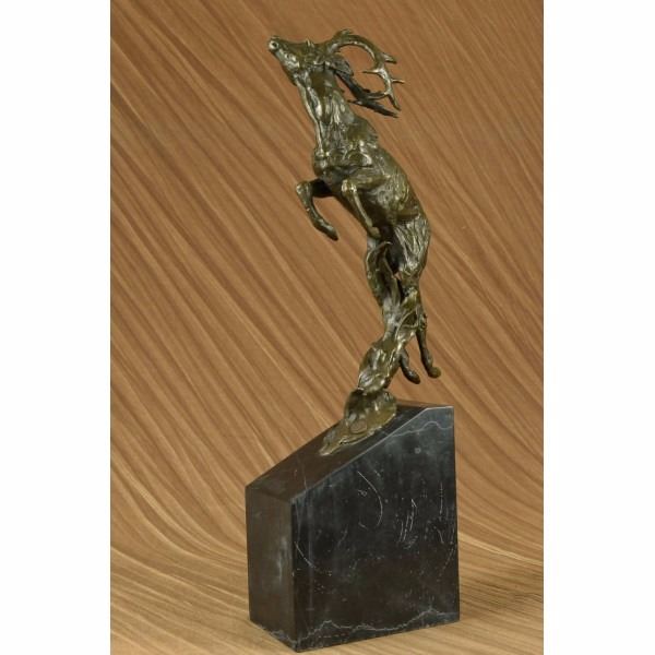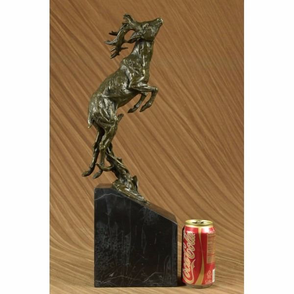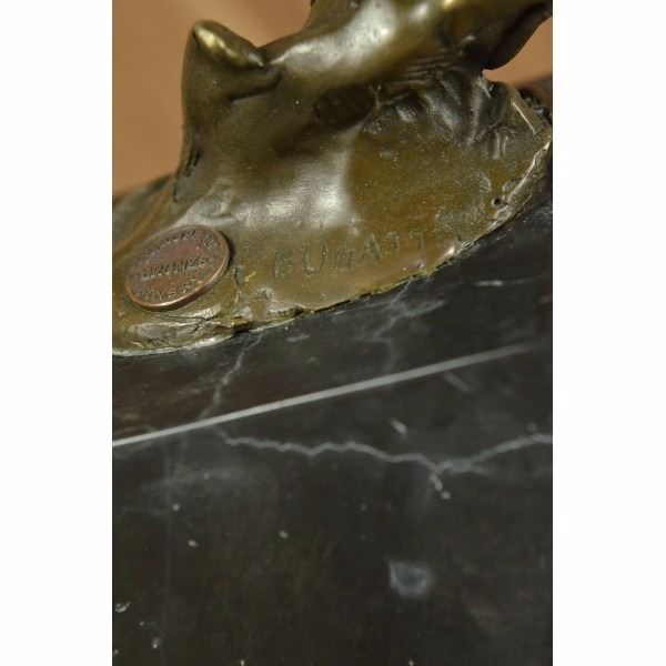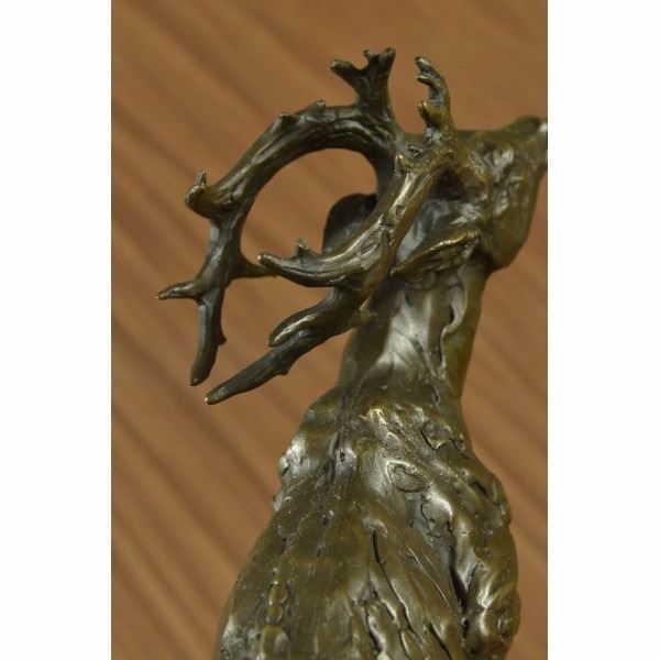 The male deer comes down the forest's edge offering a series of vocalizations for the mountains to echo across the sky and lands. He seems as though he is on a mission to find a mate. His crown of tall antlers will be used to for sparring (antler wrestling) with another male to gain the rights of dominance and courtship with the desired female. The handmade bronze sculpture was cast using the age-old method of lost-wax casting and stained with a brown patina finish for perpetuation. He is mounted upon a black circular marble base with the European Bronze Finery stamp of quality and is signed by artist Bugatti. Condition: This sculpture is in perfect condition. Bronze Dimensions with Marble Base:Height 21" x Width 14" Marble Dimensions: 7" X 4" Height without base: 14" Weight : 22LBS Inventory: 38AL3376583
