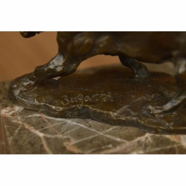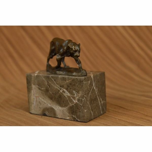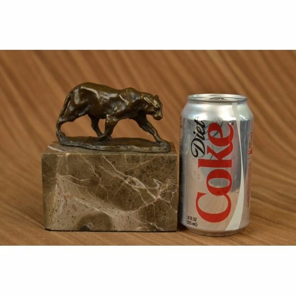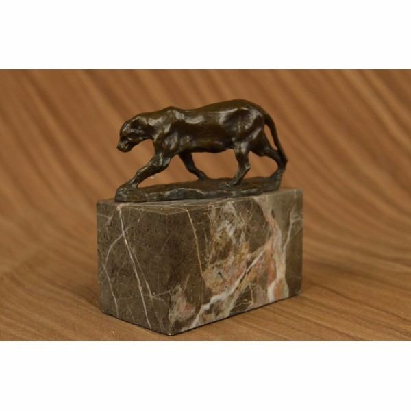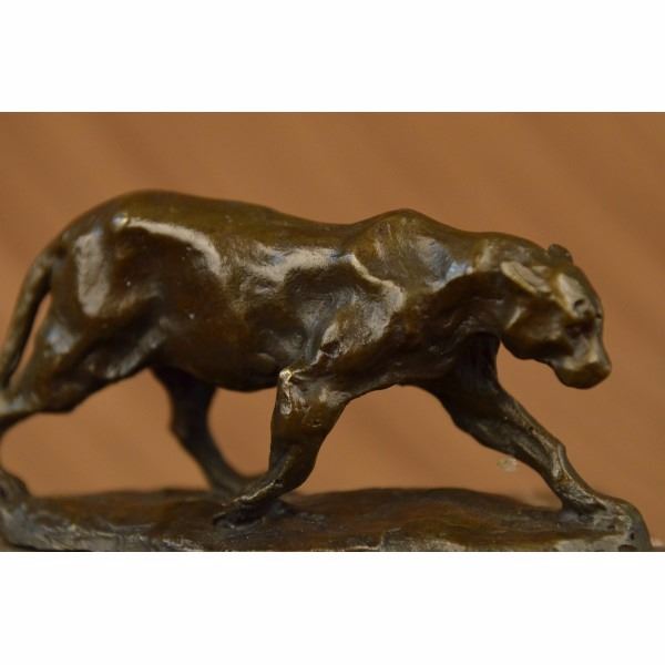 A lioness wanders through her wild African habitat after chasing away a predator from her cubs. She is fierce yet nurturing, ready to fight to the death to protect herself or her young. The deep carving of this sculpture are a tribute to the rugged strength lions possess. She appears somber here, adopting a slow pace and representing a duality of strength and calmness. This 100% bronze piece was cast using the lost wax method and is signed Bugatti. Condition: This sculpture is in perfect condition. Bronze Dimensions with Marble Base:Height 6" x Width 5" Marble Dimensions: 5" X 3" Height without base: 3" Weight : 5 LBS Inventory : 52XNAL2712625