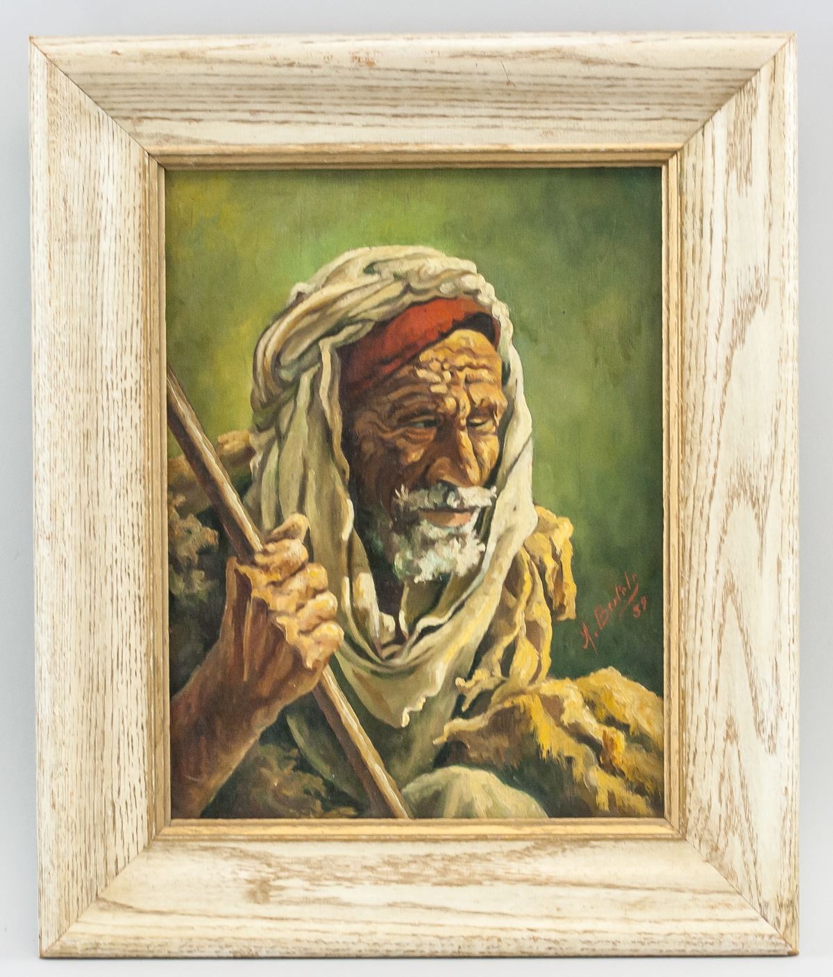 Oil on panel. Featuring portrait of an old man holding a stick. Signed "T. Butfly" to the right side, with "39" inscribed beneath the signature. 25 x 33 cm (10 x 13 in), Frame: 46 x 38 cm (18 x 15 in)