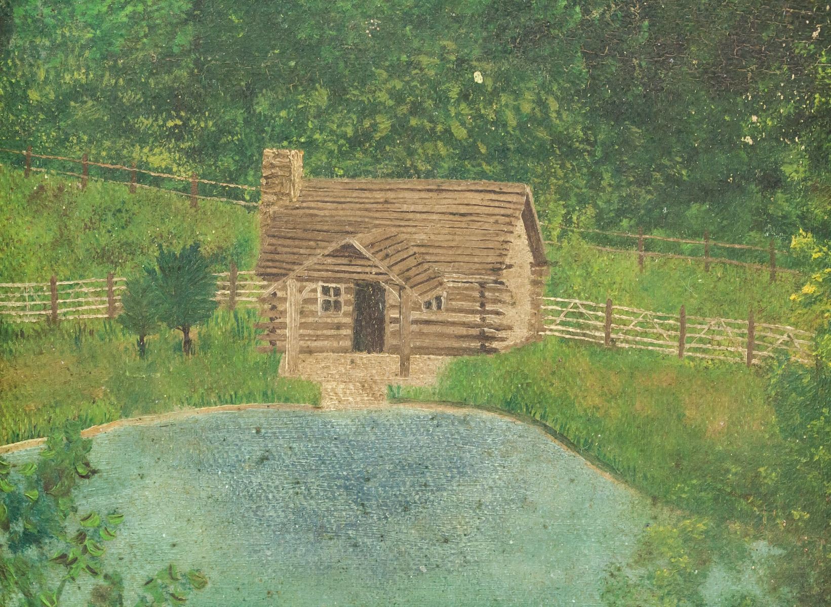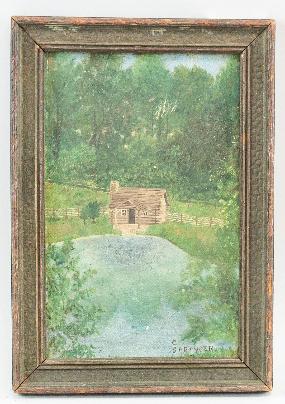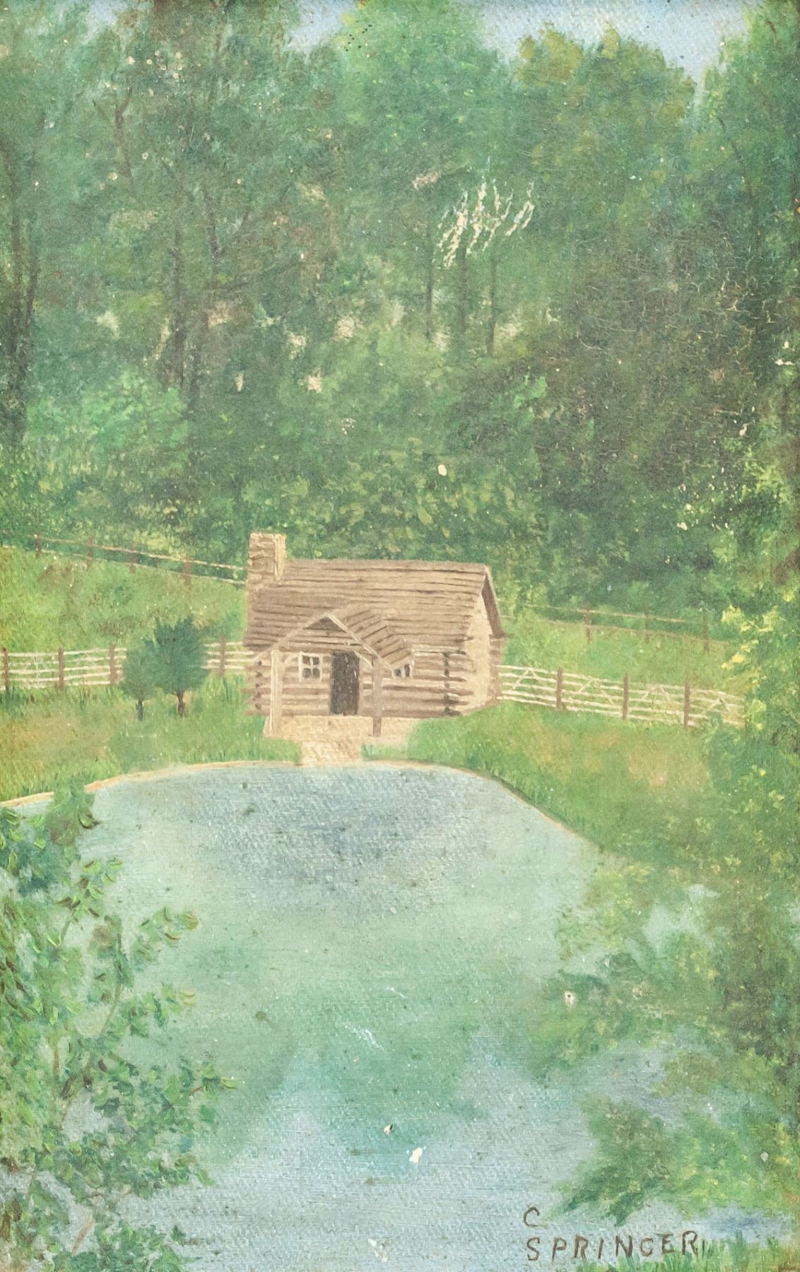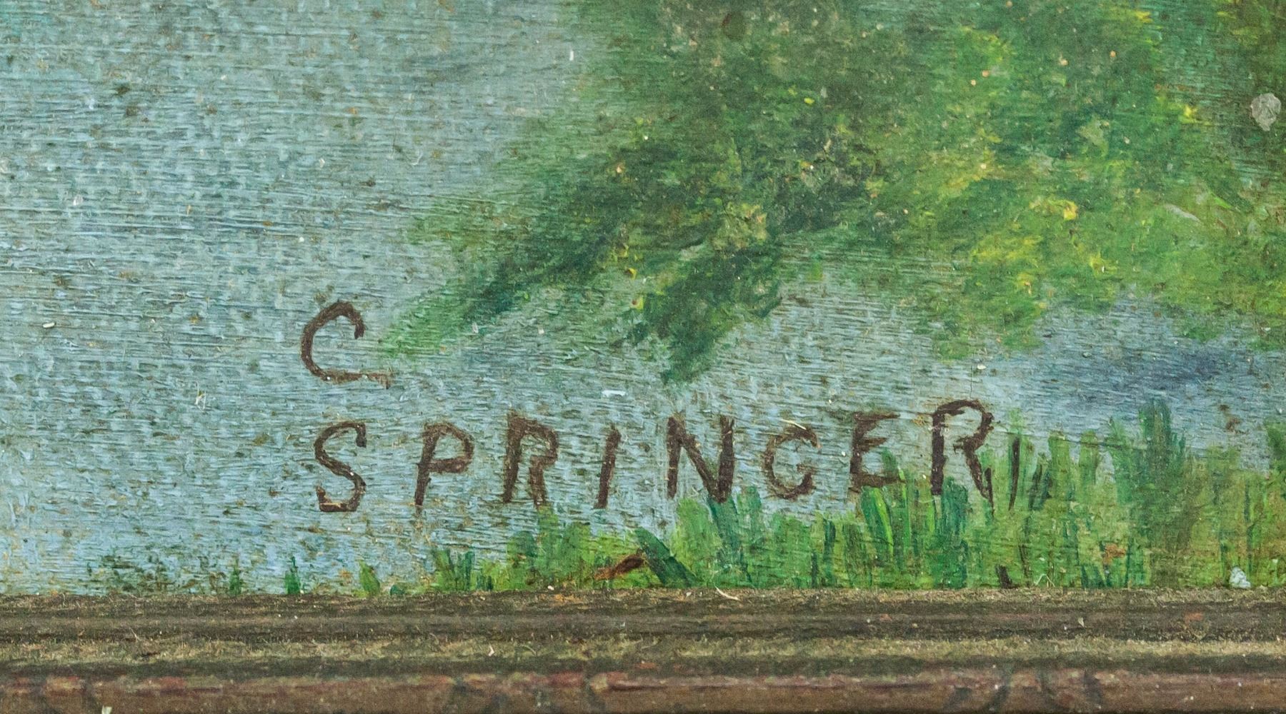 Oil on board, framed. Featuring a small wooden hut by a large lake. Signed "C SPRINGER" in the bottom right corner. 23 x 15 cm (9 x 6 in), Frame: 28 x 19 cm (11 x 7.5 in).