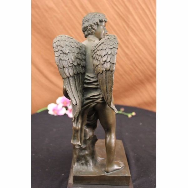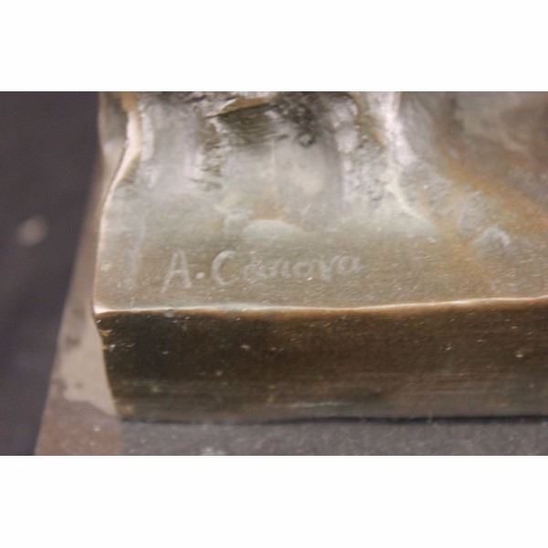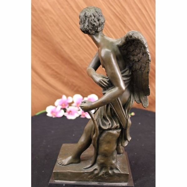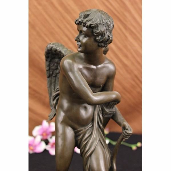 Condition: This sculpture is in perfect condition. Bronze Dimensions with Marble Base:Height 17 X Width 7 1/2"Marble Dimensions: 7 1/2" x 6"Height without base: 16" Weight : 20 LBSInventory: 64DS0506346 In legendary mythology Cupid-also known as Eros, is the god of love,desire and affection. He is the son of goddess Venus and god Mars. Heis always associated with carrying a bow and arrow handy whenfrolicking through the open skies. Those that are pierced by his arroware quickly inspired to fall in love with the first person thatcrosses their longing gaze. In pop culture he is frequently portrayedas a chubby cute mischievous cherub who draws back his bow withreckless abandon . He is frequently blamed for misguided love andrelationships. This sculpture depicts Cupid all grown up and in themidst of stalking his love target. He reaches to his satchel of bows,which is slung to his side. He leans on his bow that he clutches tobeside him. His face is mischievous and sly. His target won't knowwhat hit him. His young body is muscular and his nude demeanorshowcases it. 100% bronze and handmade, this brown patina sculpturewas cast using the "Lost Wax Method" and mounted on a black marblebase and is signed A. Canova. Condition: This sculpture is in perfect condition. Bronze Dimensions with Marble Base:Height 17 X Width 7 1/2"Marble Dimensions: 7 1/2" x 6"Height without base: 16" Weight : 20 LBSInventory: 64DS0506346 In legendary mythology Cupid-also known as Eros, is the god of love,desire and affection. He is the son of god