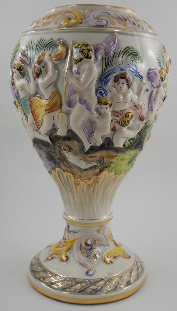 13" x 7-1/2" x 6". This is a multi-colored vase with cherubs, maidens and other images. There is crazing along the white parts of the vase. Signed on the bottom "FLPA - ALCOBACA - MADE IN PORTUGAL - S.A. LEART CO. - 2551". This is in excellent condition with no cracks, chips or repairs. It is a beautiful piece.