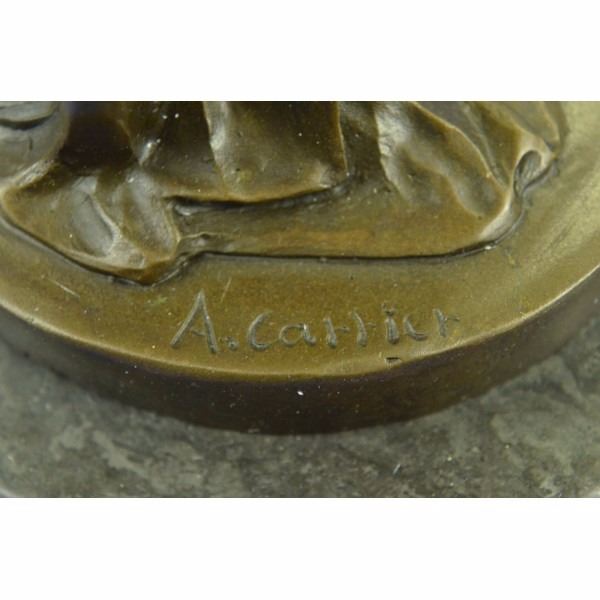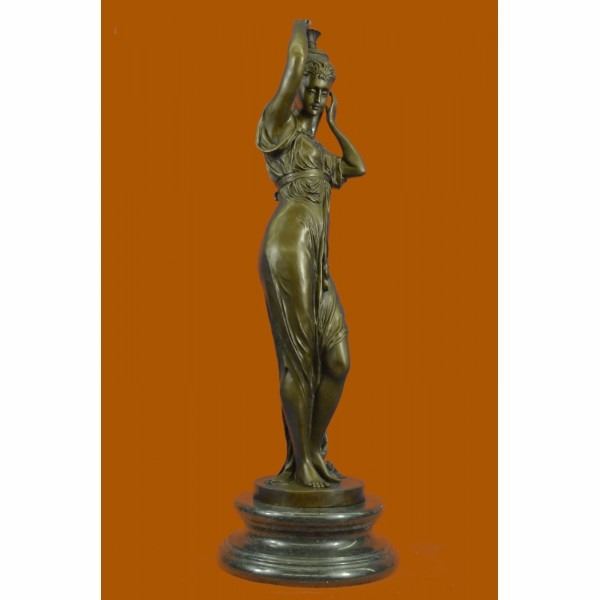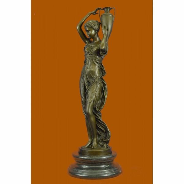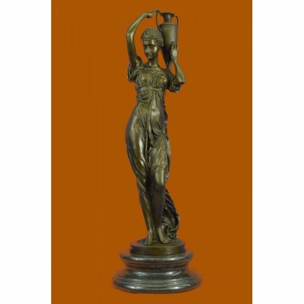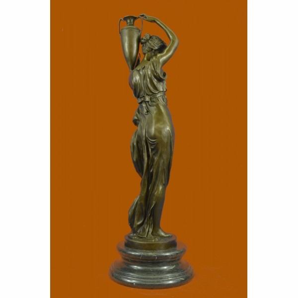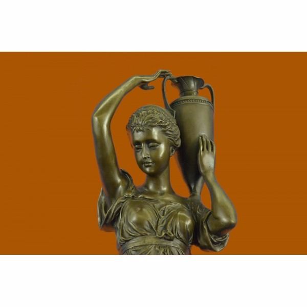 This statue is a conceptual representation of a Victorian woman standing. She carrying and holding a water jugs in her hand. She is clearly deep in thought, as her stern gaze stays fixed on a point ahead of her. Her hair cascades beautifully behind her in a manner that is actually fused with the structure of her body. This piece is slightly conceptual, as it focuses more on form rather than detail, as seen in the nonexistent details of her face, but that fact does not take away from the beauty of this piece. It features the lost wax method of casting, founded thousands of years ago, ensuring an exquisitely detailed sculpture and is signed by artist A.Carrier, that will add grace and beauty to your business or home. Condition: This sculpture is in perfect condition. Bronze Dimensions with Marble Base:Height 28" x Width 9" Marble Dimensions:Diameter 9" Height without base: 25" Weight : 35 LBS Inventory : 43YDZ040A14734
