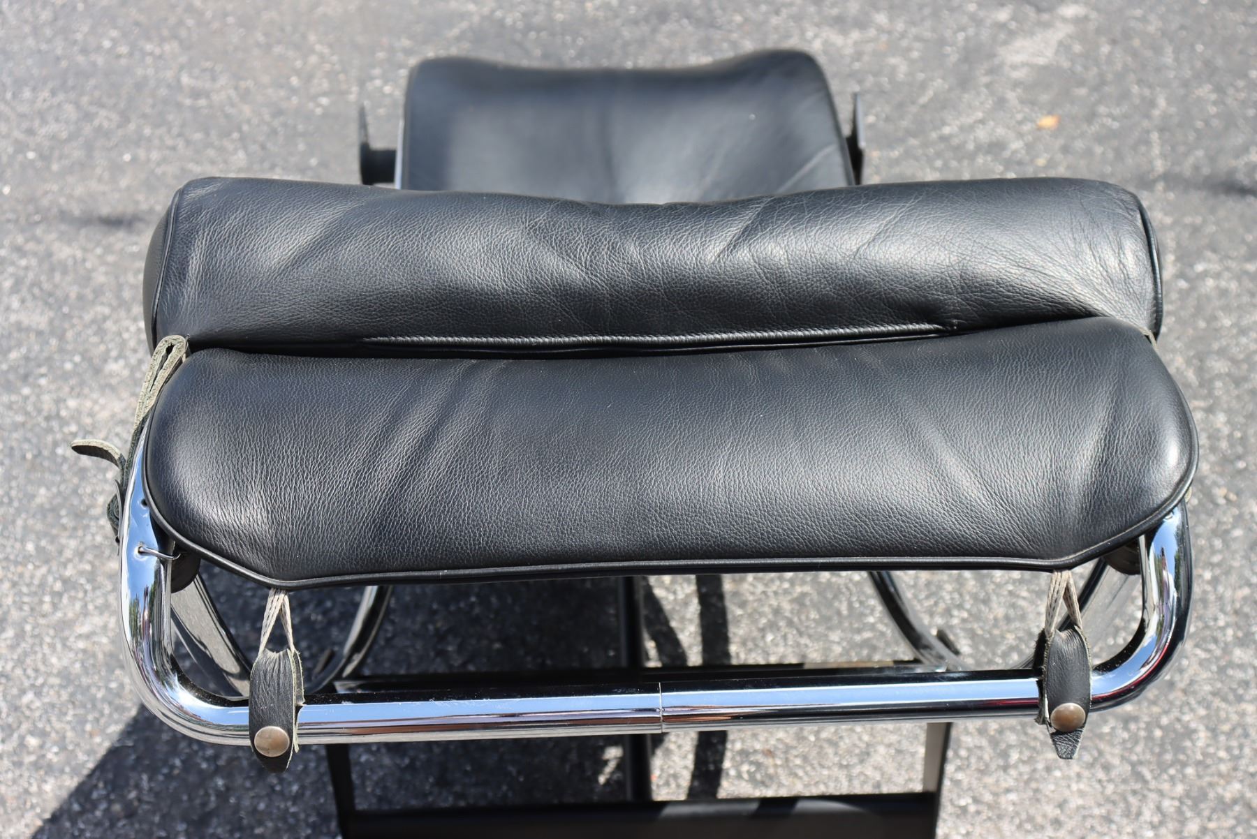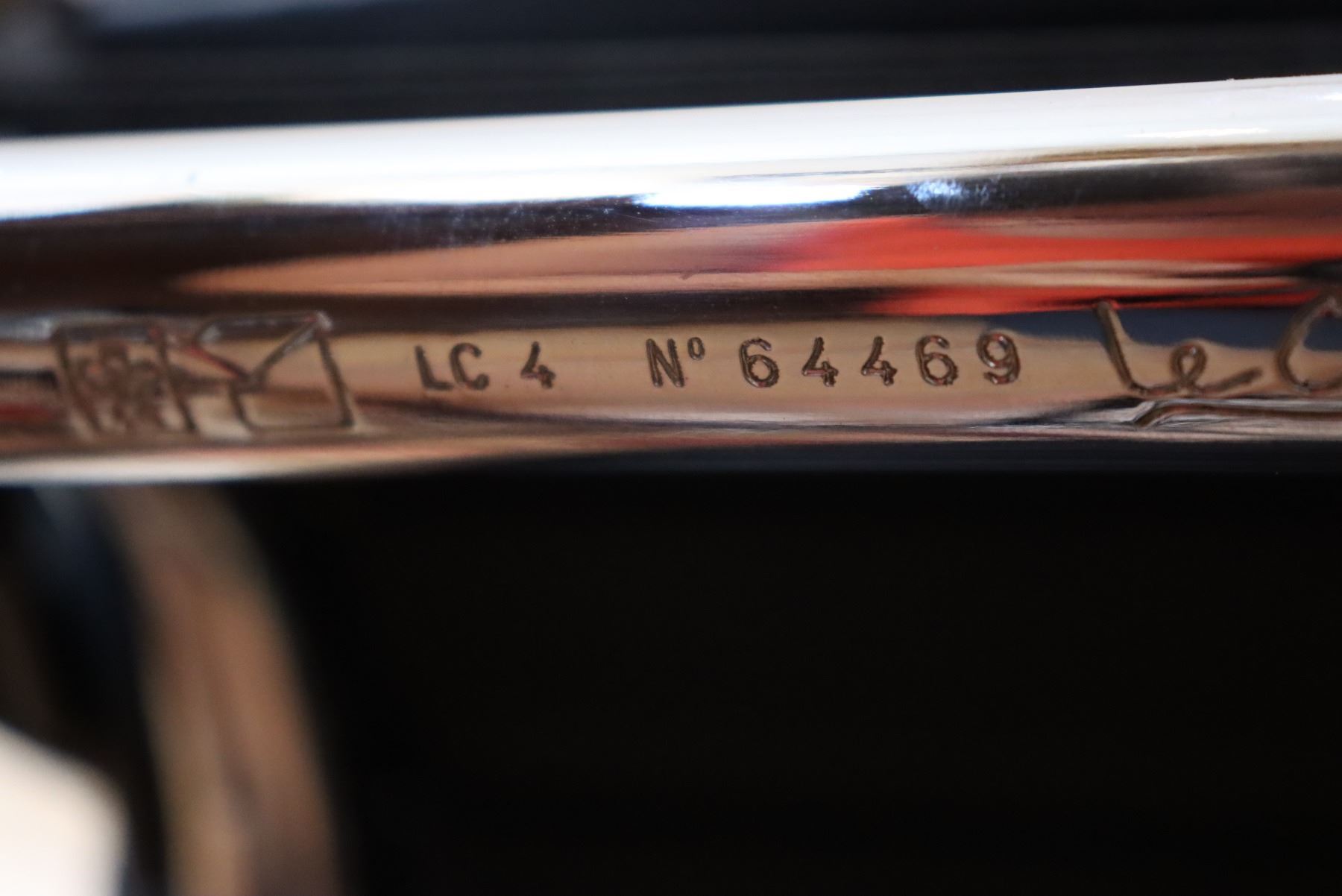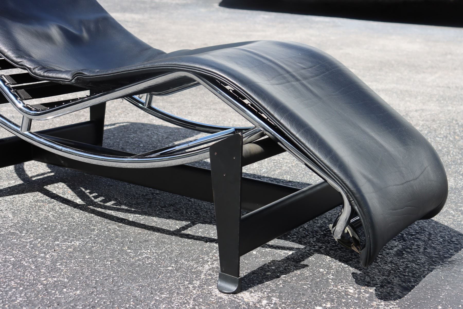 Stylish chaise lounge designed by Le Corbusier, Charlotte Perriand and Pierre Jeanneret in 1928, manufactured by Cassina, inscribed "Le Corbusier, LC/4" leather and chrome. SIze: 32 x 60 x 20 in.