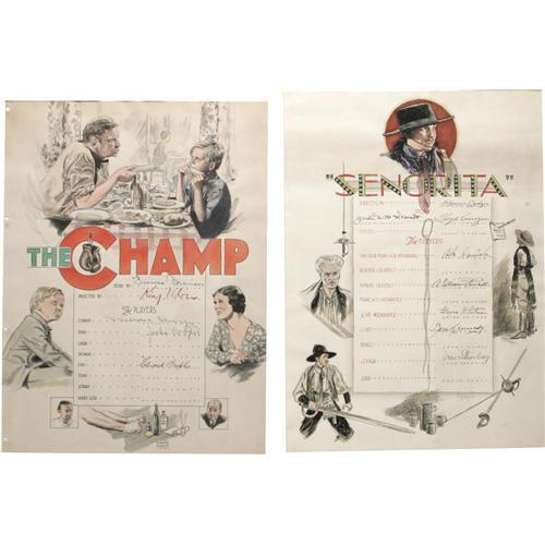 <B>Signed Cast Credits for "The Champ" and "Senorita."</B></I> Featured are ornate watercolor cast posters by artist Howard Wookey (1895-1970) for <I>Senorita</B></I> (1927) signed by Clarence Badger, Lloyd Corrigan, Bebe Daniels, William Powell, Gayne Whitman, Tom Kennedy, and Joan Standing, matted to an overall size of 23" x 18"; and for <I>The Champ</B></I> (1931) signed by Frances Marion, King Vidor, Wallace Beery, Jackie Cooper, and Edward Brophy, matted to an overall size 24" x 20.5". In overall Very Fine condition with light tanning.<I>Accompanied by LOA from PSA/DNA.</B></I><BR><BR><b>Shipping:</b> Large Flat (<a target="_blank" href="http://www.heritageauctions.com/common/shipping.php">view shipping information</a>)