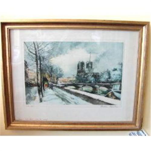 Charles Blondin, listed 20thC French artist. This is a handcolored print, ltd to 5000, number 38, signed in pencil on the lower right. Lower left written in pencil "Notre Dame cons la neige". Very nice piece!