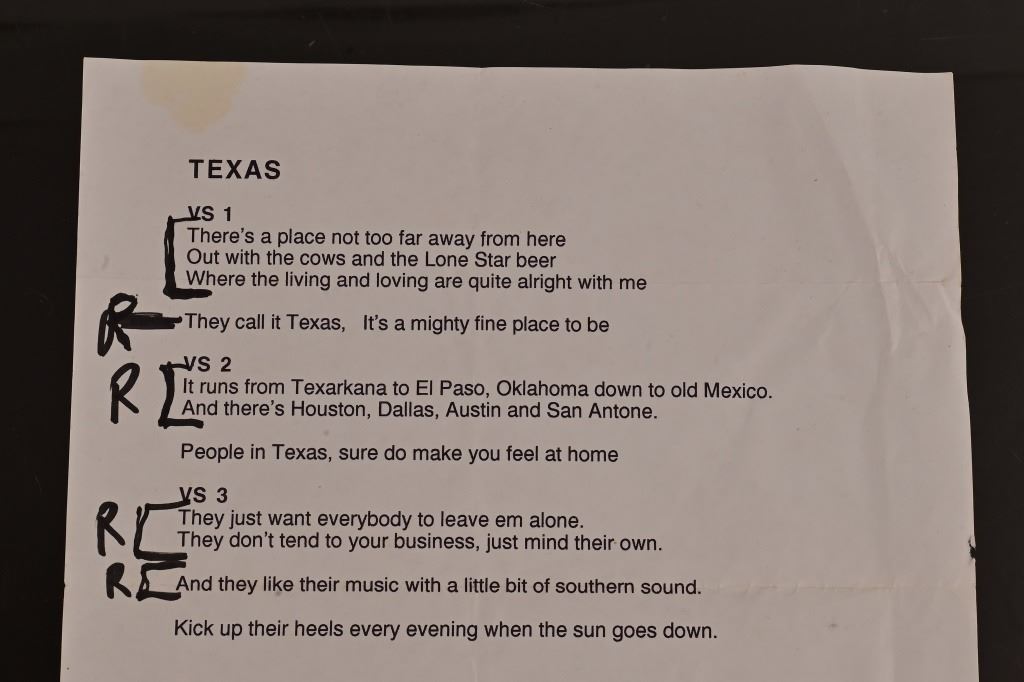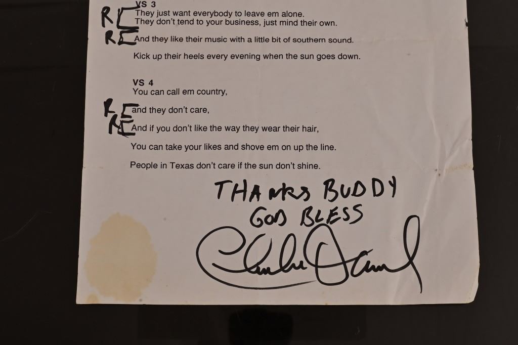 Lyrics from the studio session for Ray's guest appearance on Charlie Daniels song "Texas". Signed by Charlie Daniels. From Ray Benson's personal collection.