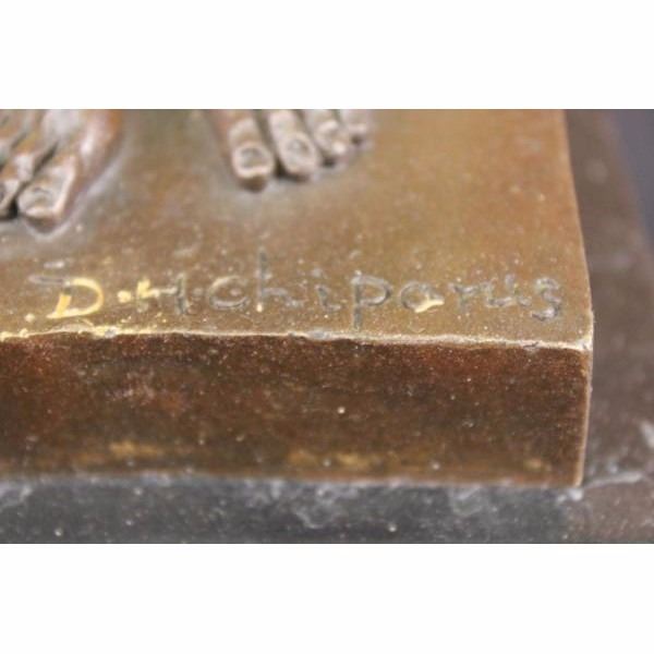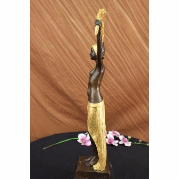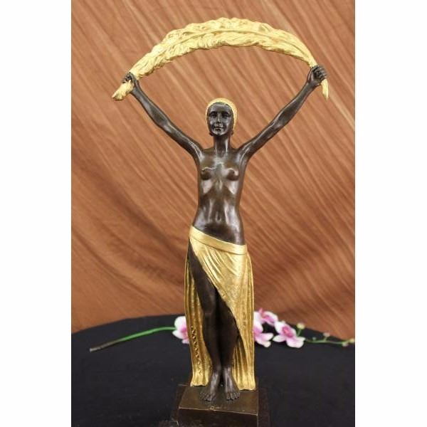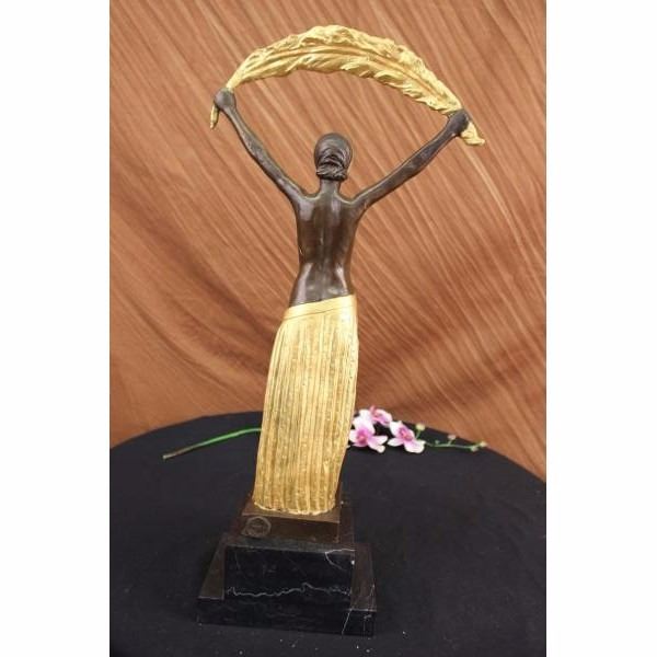 This lovely lady stands tall looking directly in front of her and she holds a feather cloth with both her hands and arms extended above her. She is wearing this gorgeous skirt that is long to her ankles and it has a beautiful side slit exposing her right thigh and a little of her left leg. She has this cute gold hat to match her outfit. She is cast using the ancient "Lost Wax Method" stained in gold and brown patina, she is mounted up top a doubled black marble base and signed by D.H Chiparus. Condition: This sculpture is in perfect condition. Bronze Dimensions with Marble Base:Height 22 1/2" x Width 10" Marble Dimensions: 7" X 5" Height without base: 19" Weight : 19 LBS Inventory : 18-X21525981