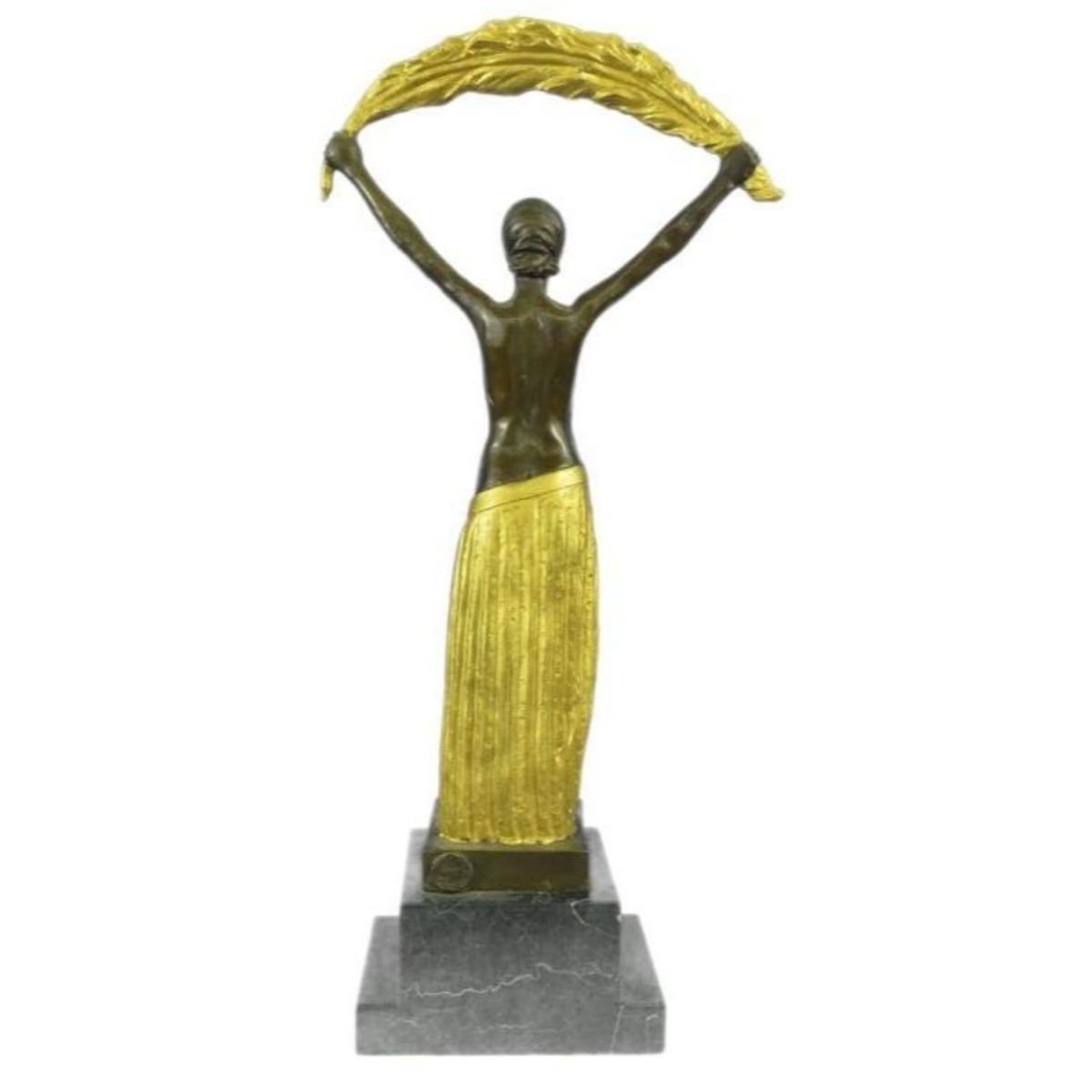 After Demetre Chiparus ( Romanian 1886 - 1947 ) art deco style dancer sculpture. Lost wax casting method bronze, with brown patina & applied gold gilt. Mounted on a marble base. 22 1/2" X 10". 19lbs.