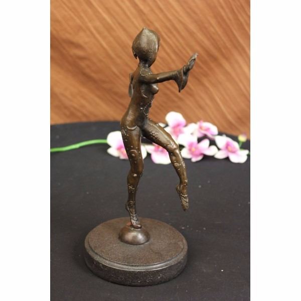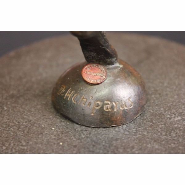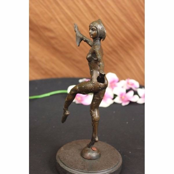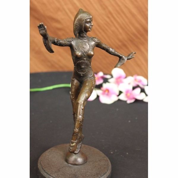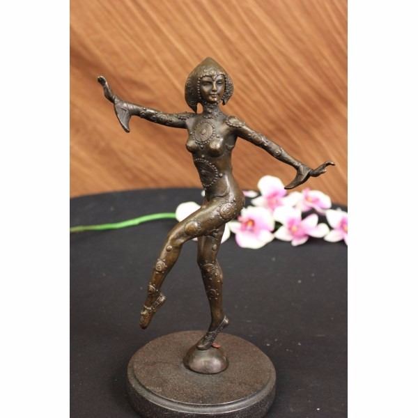 With grace, agility and flexibility, this vibrant dancer is light on her toes. Based on one of D.H. Chiparus' many sculptures of dancers, this dancer stands on the balls of her feet, as she shimmy's across the stage. Her beaded yellow patina mini skirt jiggles behind her as she shakes her hips to the music. This nimble dancer tilts her head down slightly and elegantly stretches her arms above her head. She also wears a matching beaded top, headdress and sandals. 100% bronze and handmade, this brown patina sculpture was cast using the "Lost Wax Method" and mounted on a marble base. It features the signatureChiparus. Condition : This sculpture is in perfect condition. Bronze Dimensions with Marble Base:Height 12" x Width 8" Marble Dimensions: Diameter 5" Height without base: 11 " Weight :7 LBS Inventory : 53Y9792735