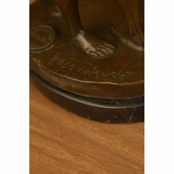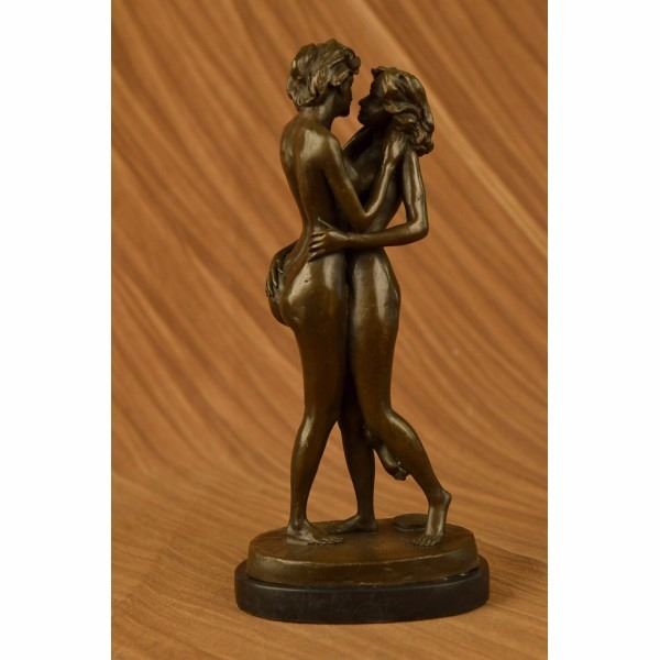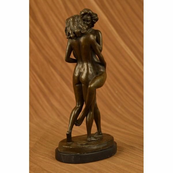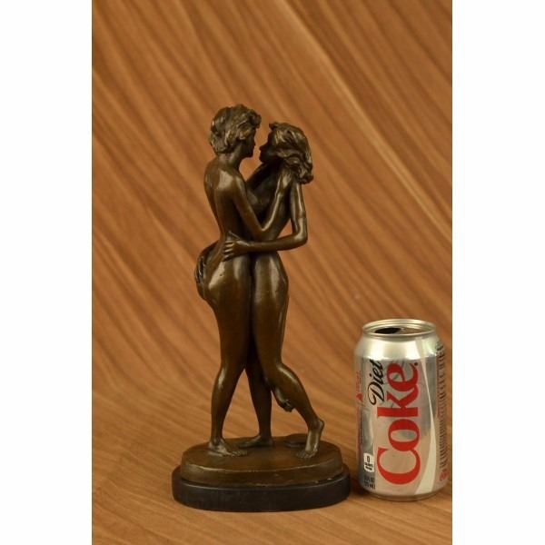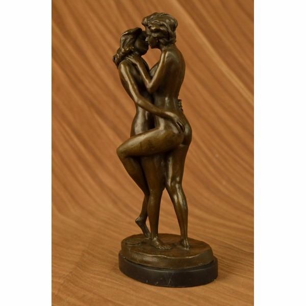 This is a Collector edition bronze sculpture featuring two gorgeous woman embracing each other. Her eyes are closed as she wraps her lips around lips of her partner. Waves of her hair twist and shape to the base of the piece. these sculptures have been hand crafted and signed by artist Pasquale Delor. Very unique in design this work of art embraces a women's choice of sexuality and pleasure. All of our bronze sculptures are hand crafted through the lost wax process, not be mistaken for cheap resin. Condition: This sculpture is in perfect condition. Bronze Dimensions with Marble Base:Height 11" x Width 5" Marble Dimensions:Diameter 5" Height without base: 10" Weight : 8 LBS Inventory : 35X12365553