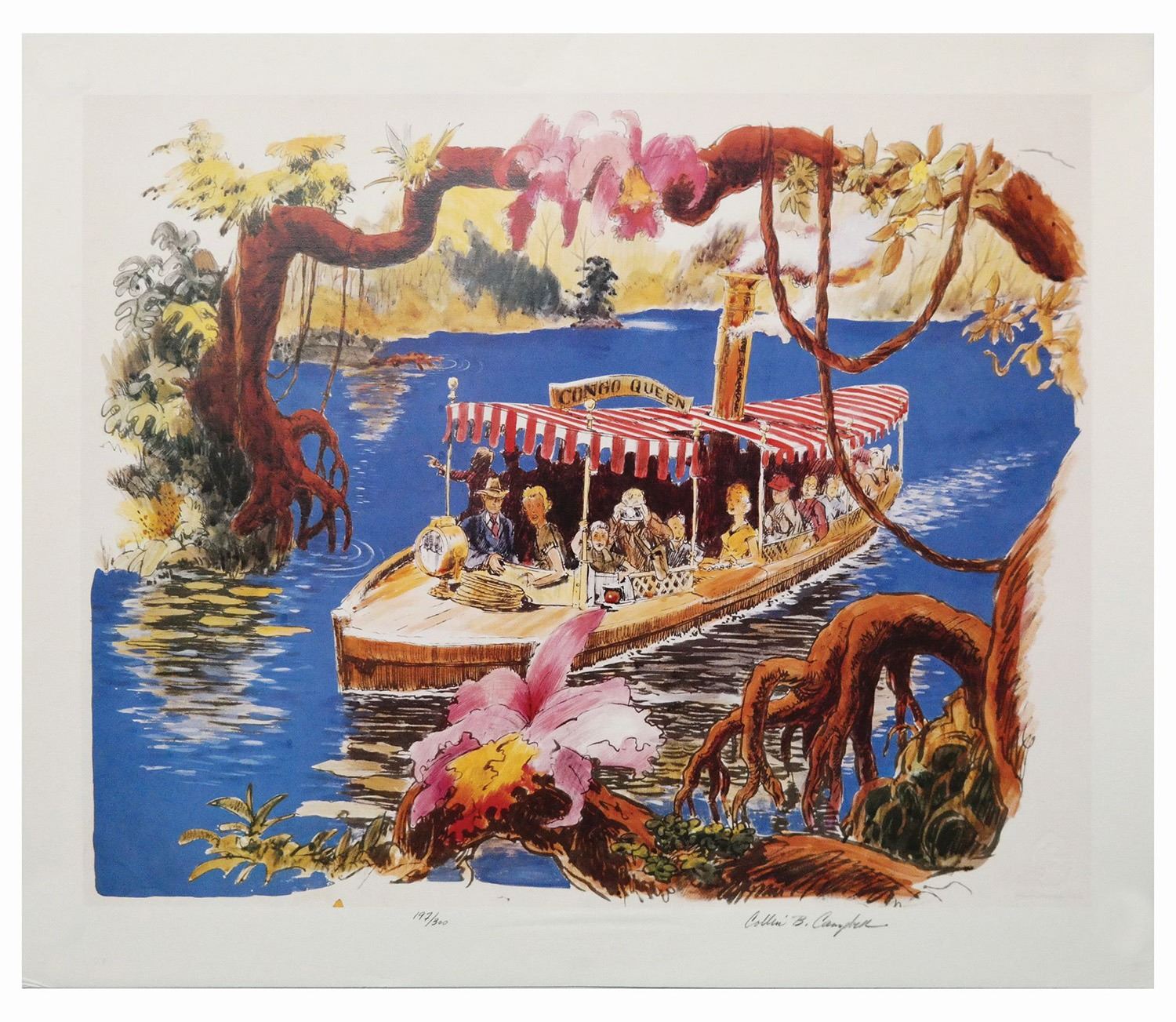 (Disneyland, 1987) A limited edition concept art print signed by Imagineer Collin Campbell. The print features Campbell's concept for the Jungle Cruise, and is number 197 in an edition of only 300 offered through the Disney Gallery. The print is signed by Campbell in the lower right. Measuring 23"x28", the condition is fair with some creasing and wear along the edges.