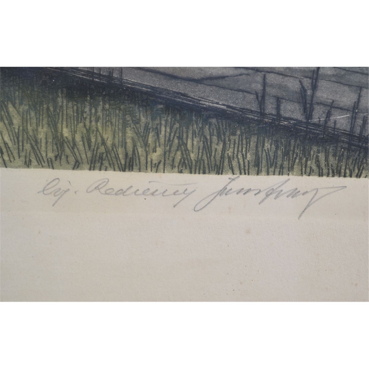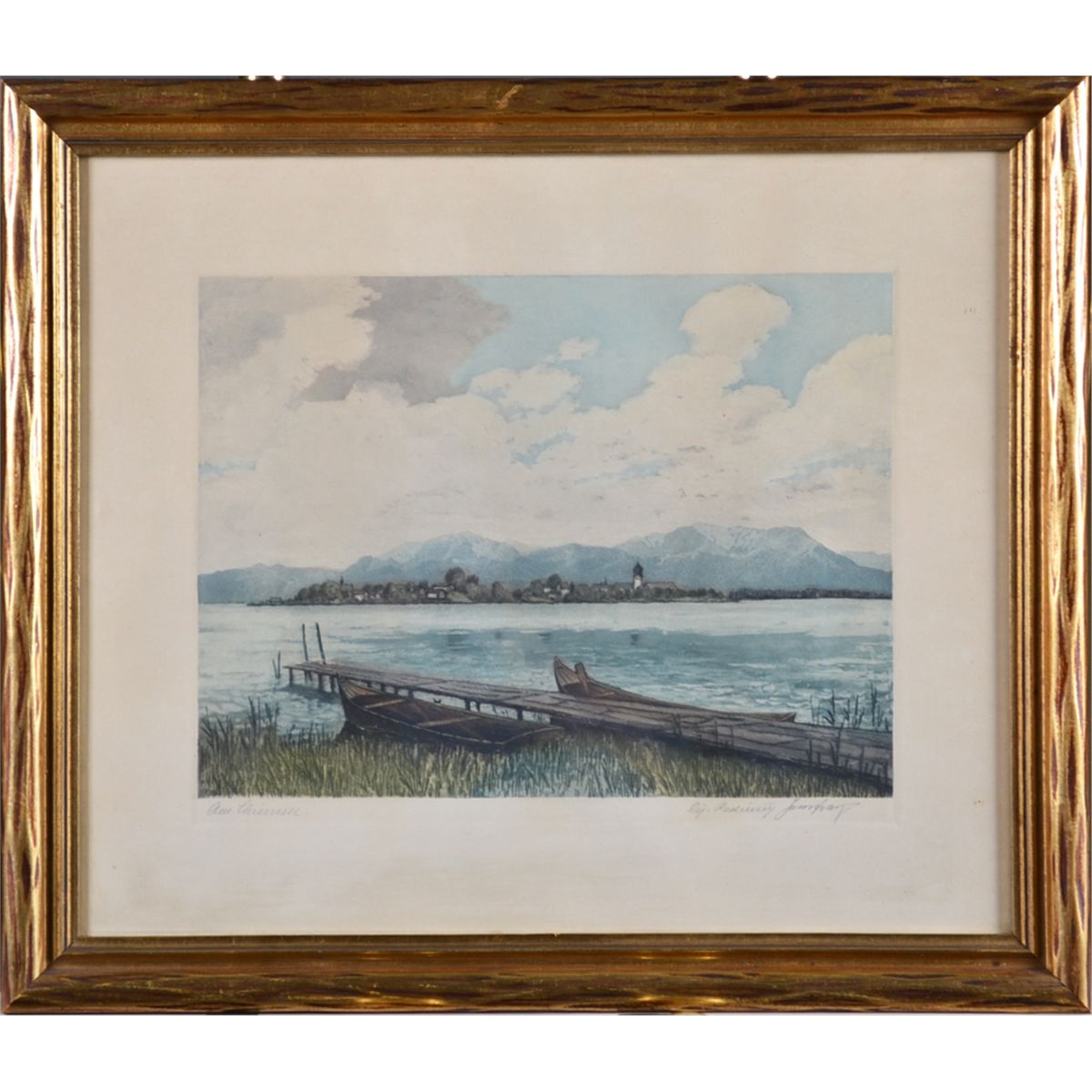 Depicting a bridge with rowboat and mountain village in the distance. Signed in pencil in LR illegibly and titled in pencil in LL illegibly. In a painted gold frame and behind glass, 18" H x 21" W, including the frame. Circa early 20th century. Private collection St. Clair Shores, MI.