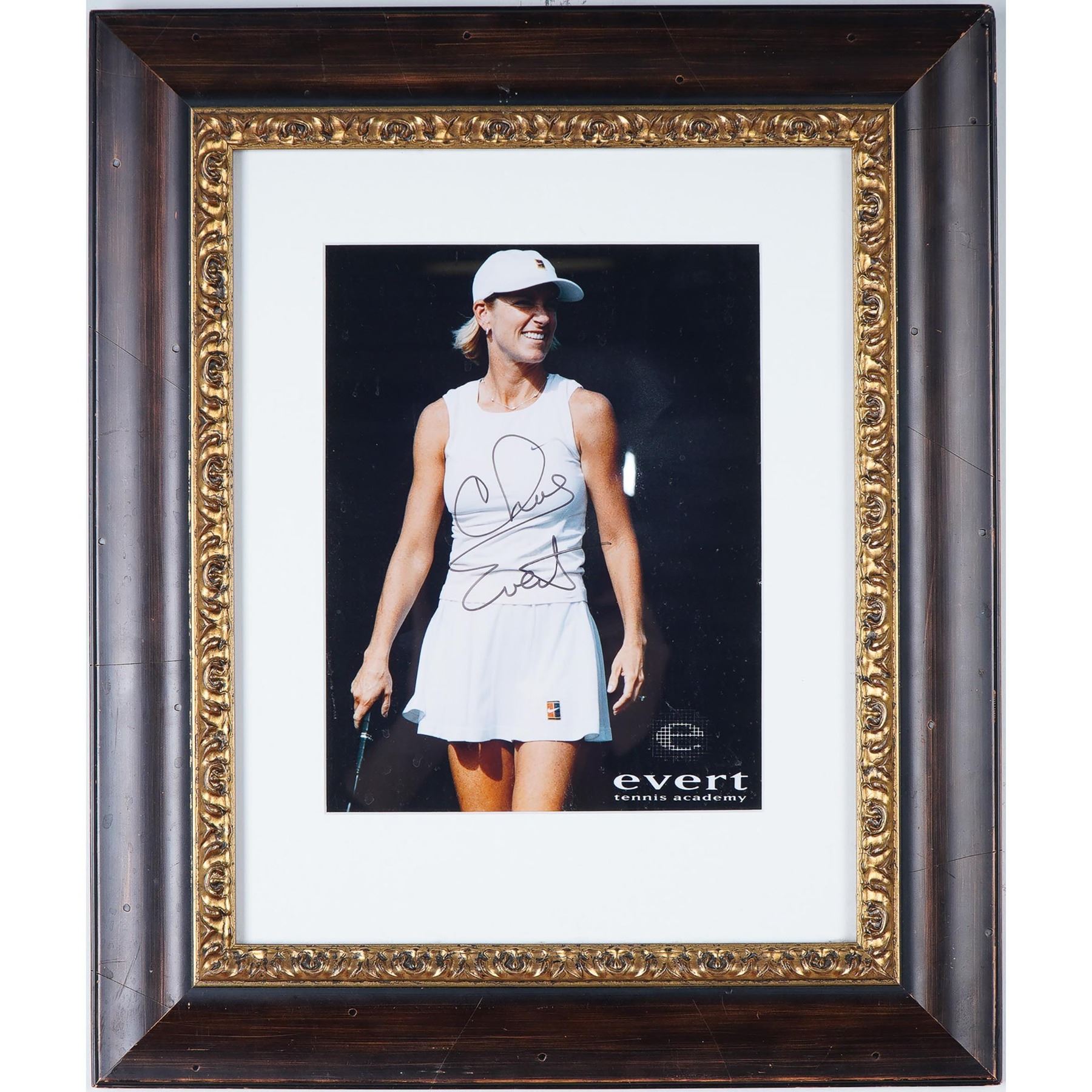 Framed color photograph signed by legendary American tennis champion Chris Evert. The image captures Evert in action on the court, dressed in her classic white tennis attire, exuding the poise and confidence that defined her career. Chris Evert, a former World famous tennis player, dominated women tennis during the 1970s and 1980s, winning 18 Grand Slam singles titles, including seven French Open and six US Open titles. Known for her precision, mental toughness, and groundbreaking two-handed backhand, she was inducted into the International Tennis Hall of Fame in 1995. Framed and the bold, black marker autograph prominently displayed across the photograph.