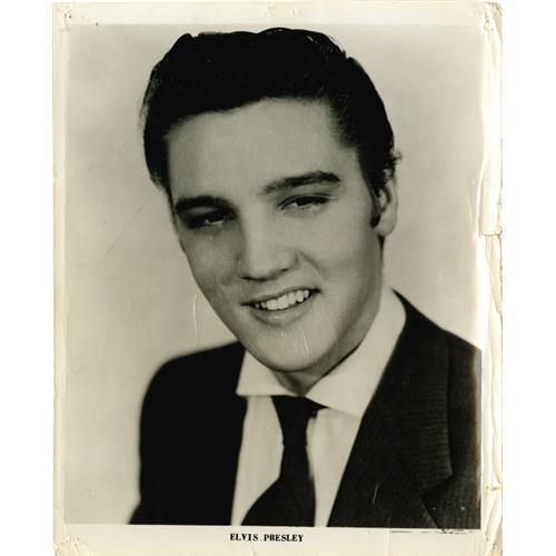 <B>Signed Copy of One of Elvis' First Promo Photos.</B></I> Considered one of Elvis Presley's first promotional photographs, this b&w 8" x 10" dates circa 1955 and features a striking close-up of the future King of Rock and Roll and is boldly signed on the back "Yours, Elvis Presley" in blue ink. A very rare item in great condition with minor creasing and wear to the edges and tack holes to the corners. <I>Includes a COA from PSA/DNA.</B></I>